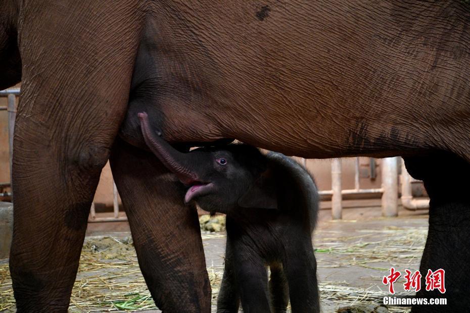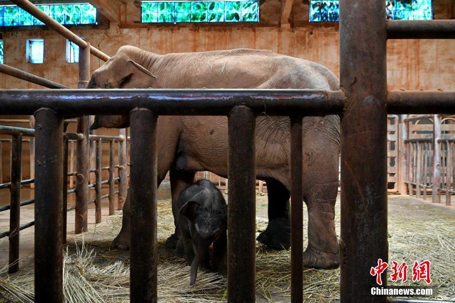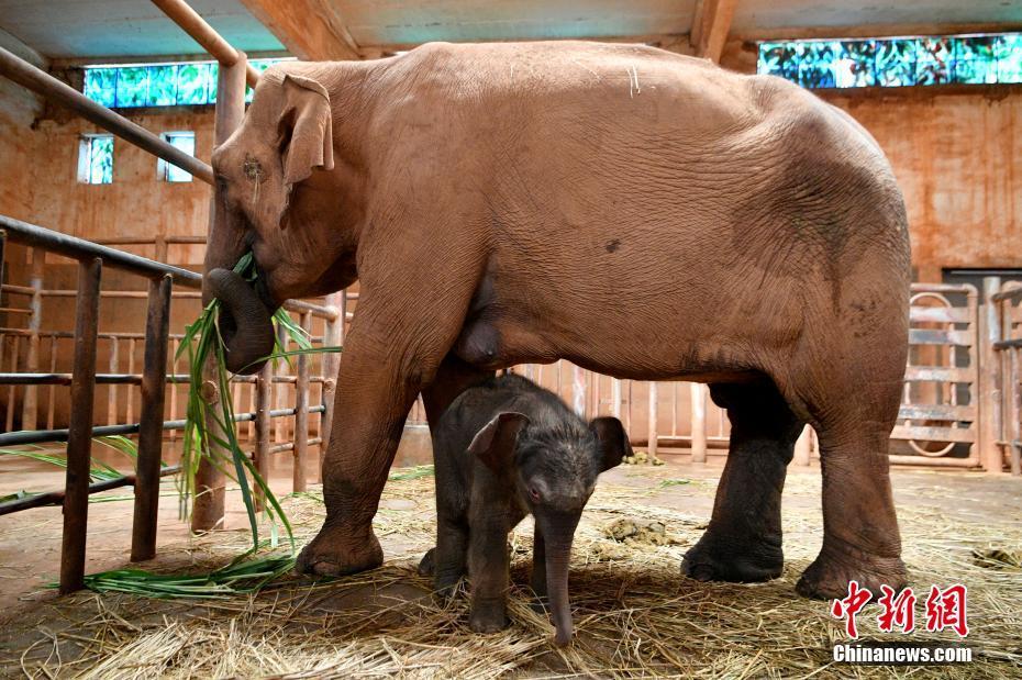 10月20日,新生亚洲象宝宝与母亲“亚明”。近日,云南省昆明动物园的亚洲象“亚明”产下一头雄性亚洲象。目前新生小象各项指标正常,与母亲“亚明”处于健康免疫隔离保护期,暂时无法与公众见面。 中新社记者 李嘉娴 摄