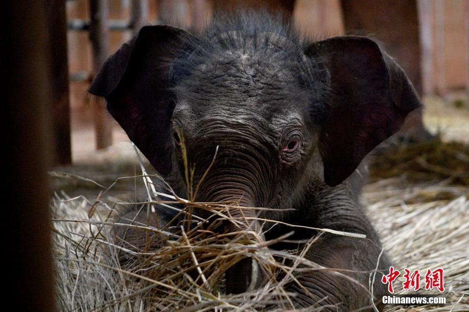 10月20日,新生亚洲象宝宝在干草堆里玩耍。近日,云南省昆明动物园的亚洲象“亚明”产下一头雄性亚洲象。目前新生小象各项指标正常,与母亲“亚明”处于健康免疫隔离保护期,暂时无法与公众见面。 中新社记者 李嘉娴 摄