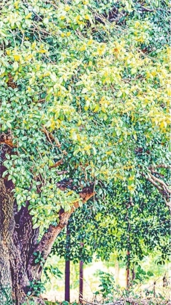 在江夏区山坡街道唐家湾,记者看到了有生以来见过的最大的一株桂花树。它生长在该湾东边400米左右的农田里,比周围的树高出一大截,目前正值盛花期,一团团金色的花球,将整株树都染成了金黄,浓香四溢。远远看去,如同“鹤立鸡群”一般,一个金色的圆球十分显眼。