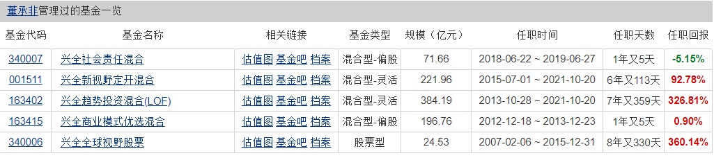 在兴全基金的18年里,董承非共管理过5只基金,其中兴全商业模式优选混合、兴全全球视野股票、兴全社会责任混合早在2013年、2015年和2019年离任,近几年管理的基金仅有兴全新视野定开混合、兴全趋势投资混合(LOF)两只。