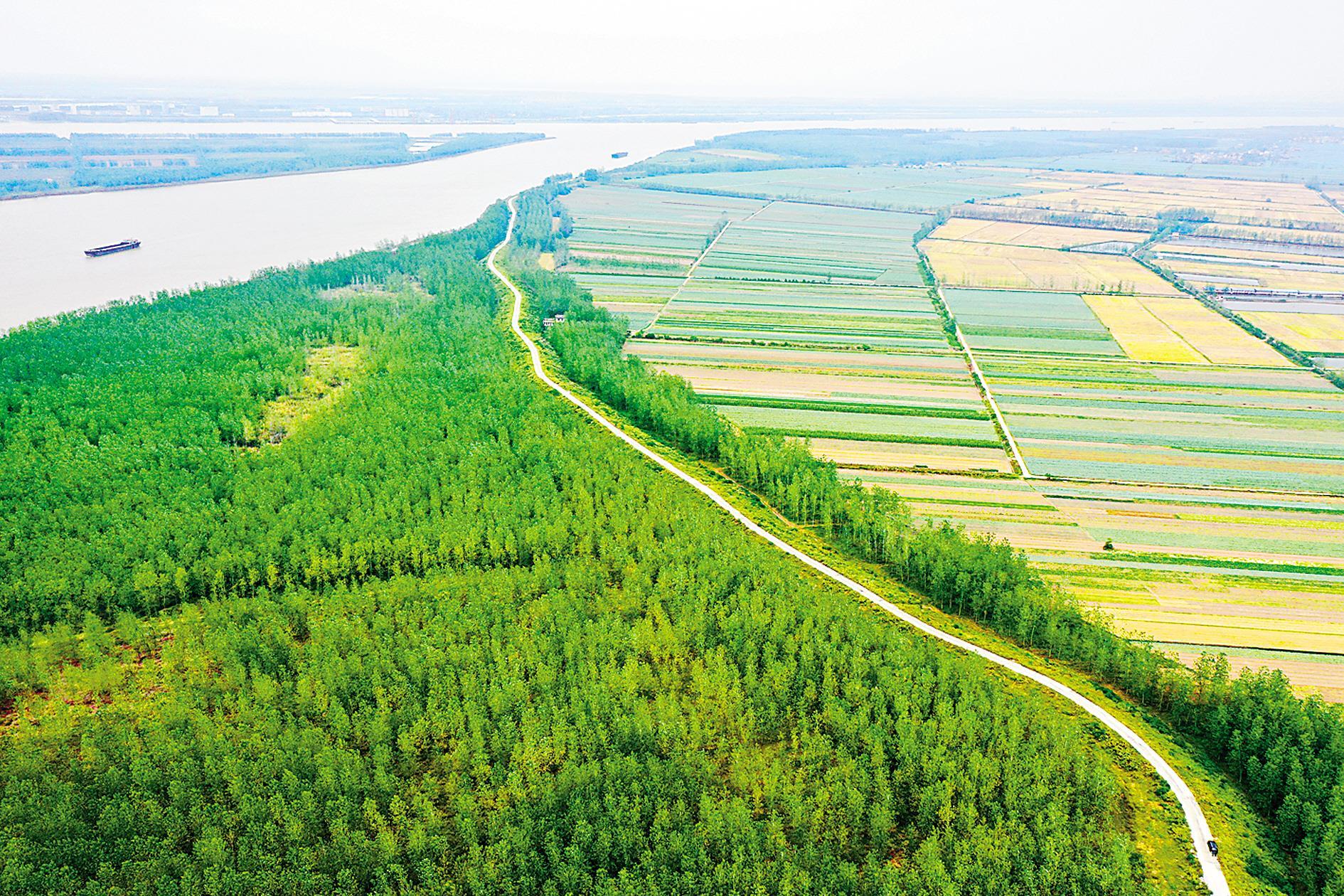 10月13日,咸宁市嘉鱼县簰洲湾镇长江大堤两边的防浪林郁郁葱葱。咸宁市拥有128公里长江岸线。2018年至2020年,该市累计完成长江沿岸造林绿化11.44万亩,占省定任务10.84万亩的105.54%,超额完成造林任务。