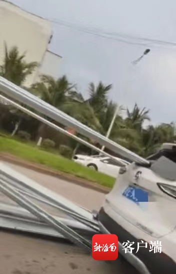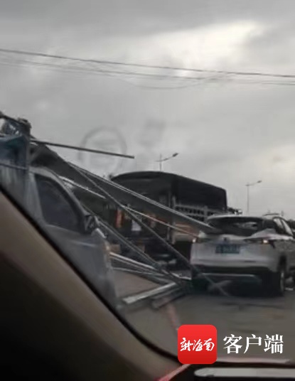 海口一货车所拉的钢筋急刹车后插入前车车身内。网友提供视频截图