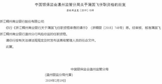 据中国经济网记者查询,2019年2月19日,中国银保监会温州监管分局发布了关于蒲国飞任职资格的批复(温银保监复〔2019〕15号),核准蒲国飞浙江稠州商业银行温州分行风险总监的任职资格。