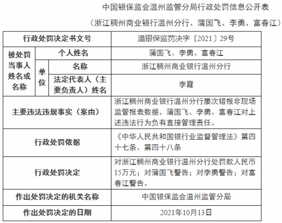 中国经济网北京10月22日讯 银保监会网站今日公布的温州监管分局行政处罚信息公开表(温银保监罚决字〔2021〕29号)显示,浙江稠州商业银行温州分行屡次错报非现场监管报表数据。蒲国飞、李勇、富春江对上述违法行为负有直接管理责任。
