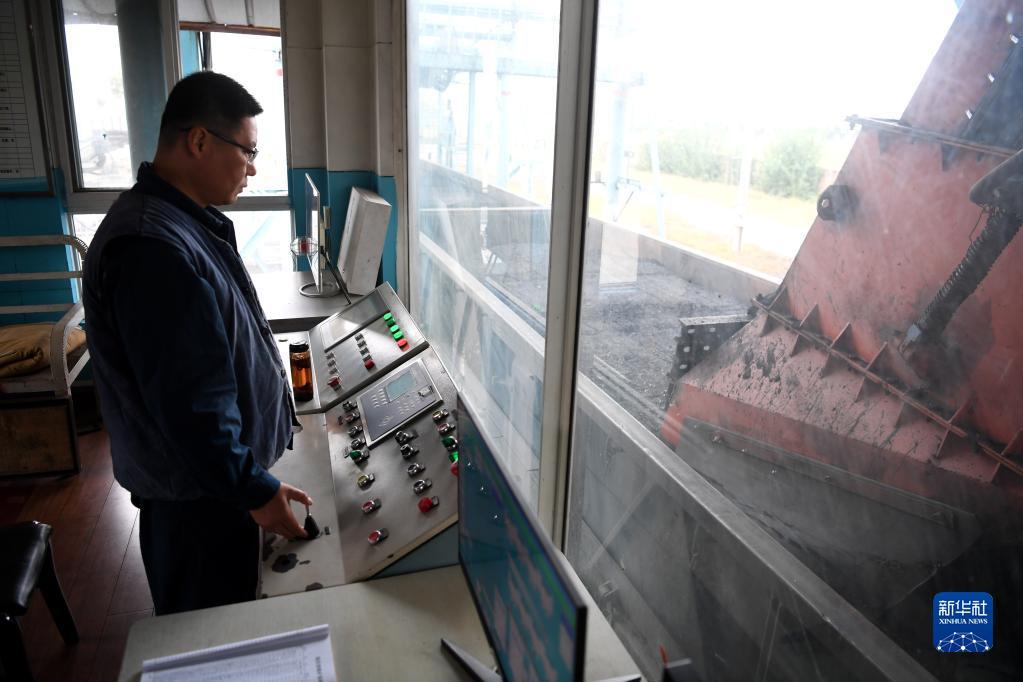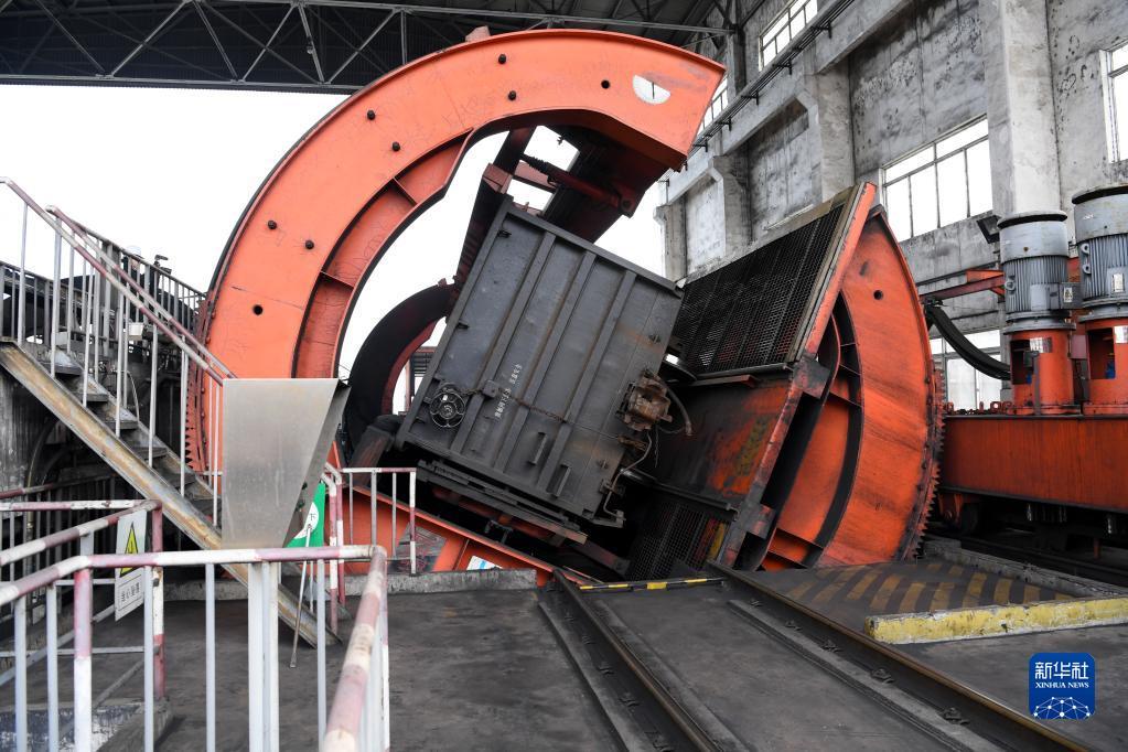 10月21日,皖能合肥发电有限公司自动化装备把满载电煤的列车车厢进行翻转卸车。新华社记者刘军喜摄
