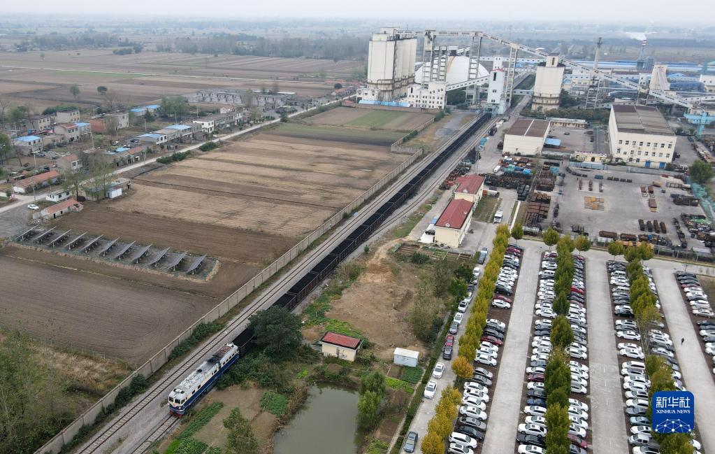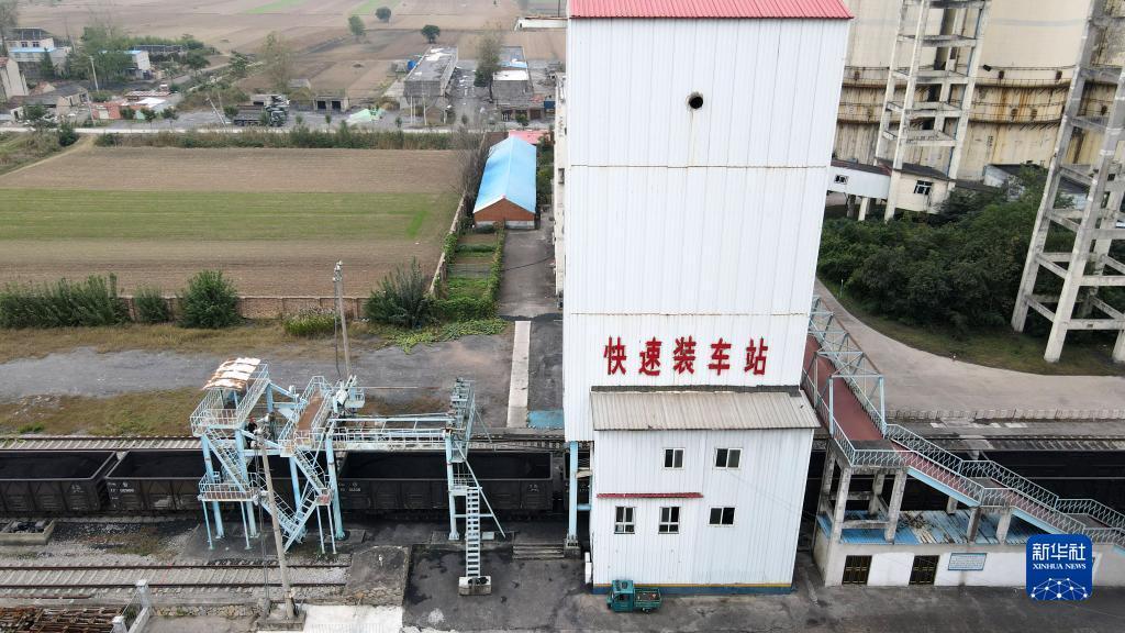 10月20日,在安徽省宿州市钱营孜煤矿,安徽铁道发展集团公司电煤专列在装运电煤(无人机照片)。新华社记者韩旭摄