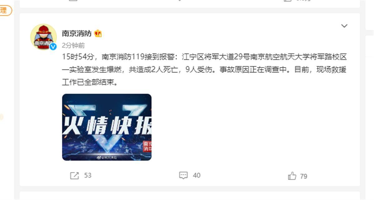 当晚,极目新闻记者多次联系南京航空航天大学党委宣传部和学校保卫处等相关部门,电话均未接通。据南京消防官方微博消息,15时54分,南京消防119接到报警,江宁区将军大道29号南京航空航天大学将军路小区一实验楼发生爆燃,共造成2人死亡,9人受伤。事故原因正在调查中。目前,现场救援工作已全部结束。