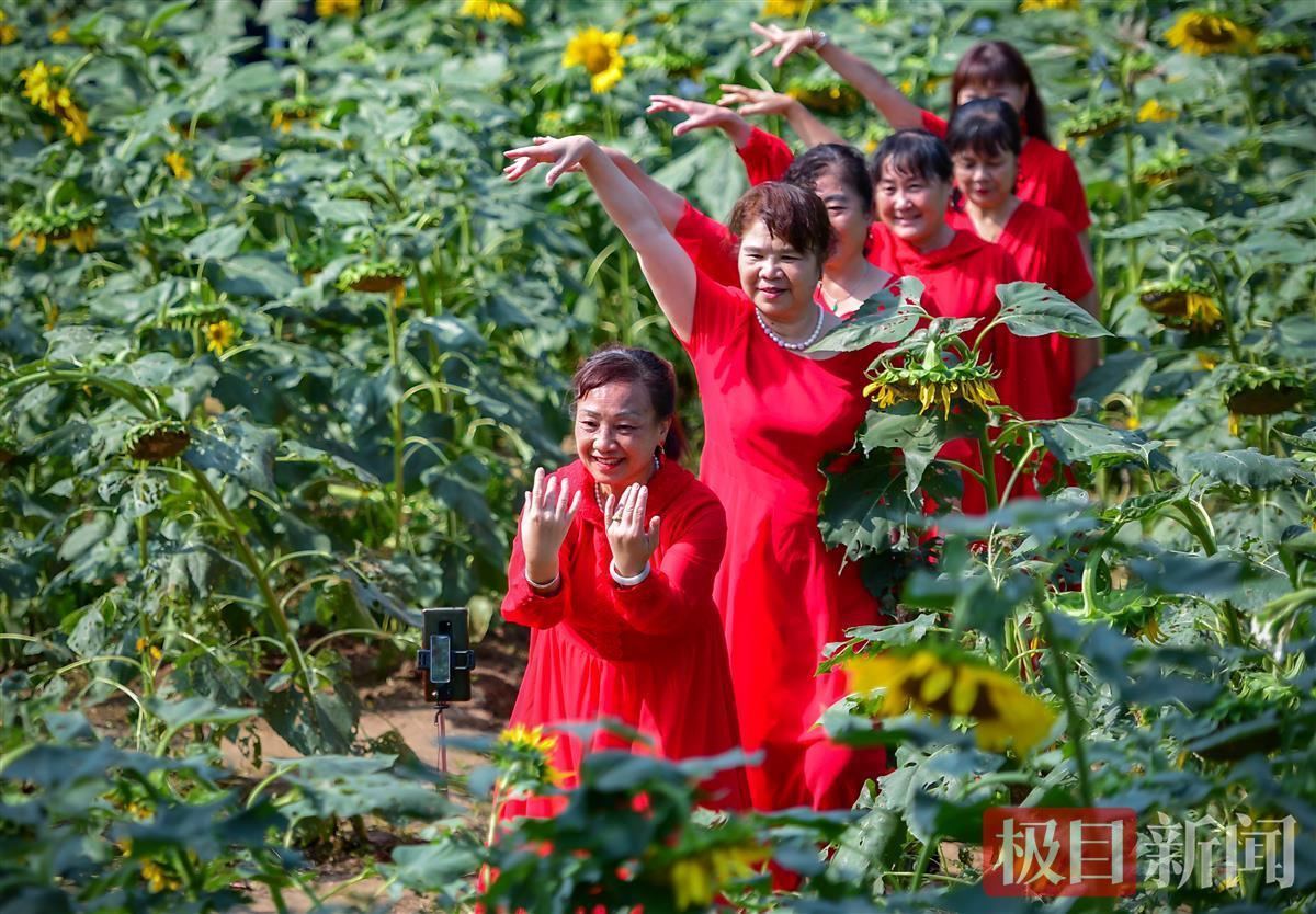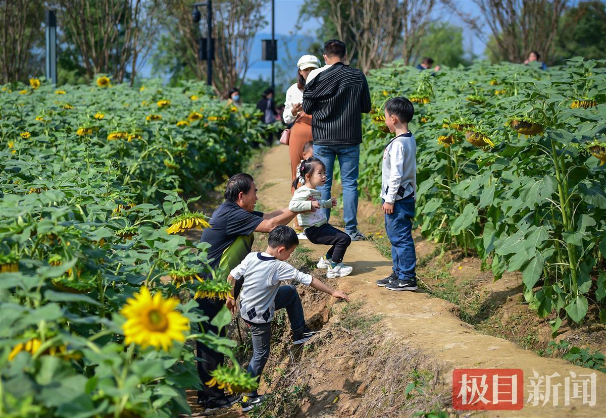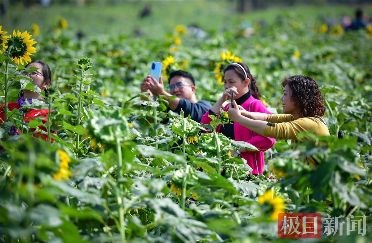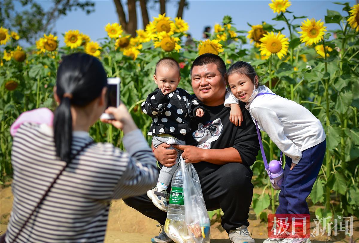 记者现场看到,漫山遍野的向日葵在秋风中迎着太阳摇曳。游客大多是拖家带口,前来欣赏这美妙的景色,大家走在花海的田埂上,或直接走进花海中,举起相机、手机打卡。