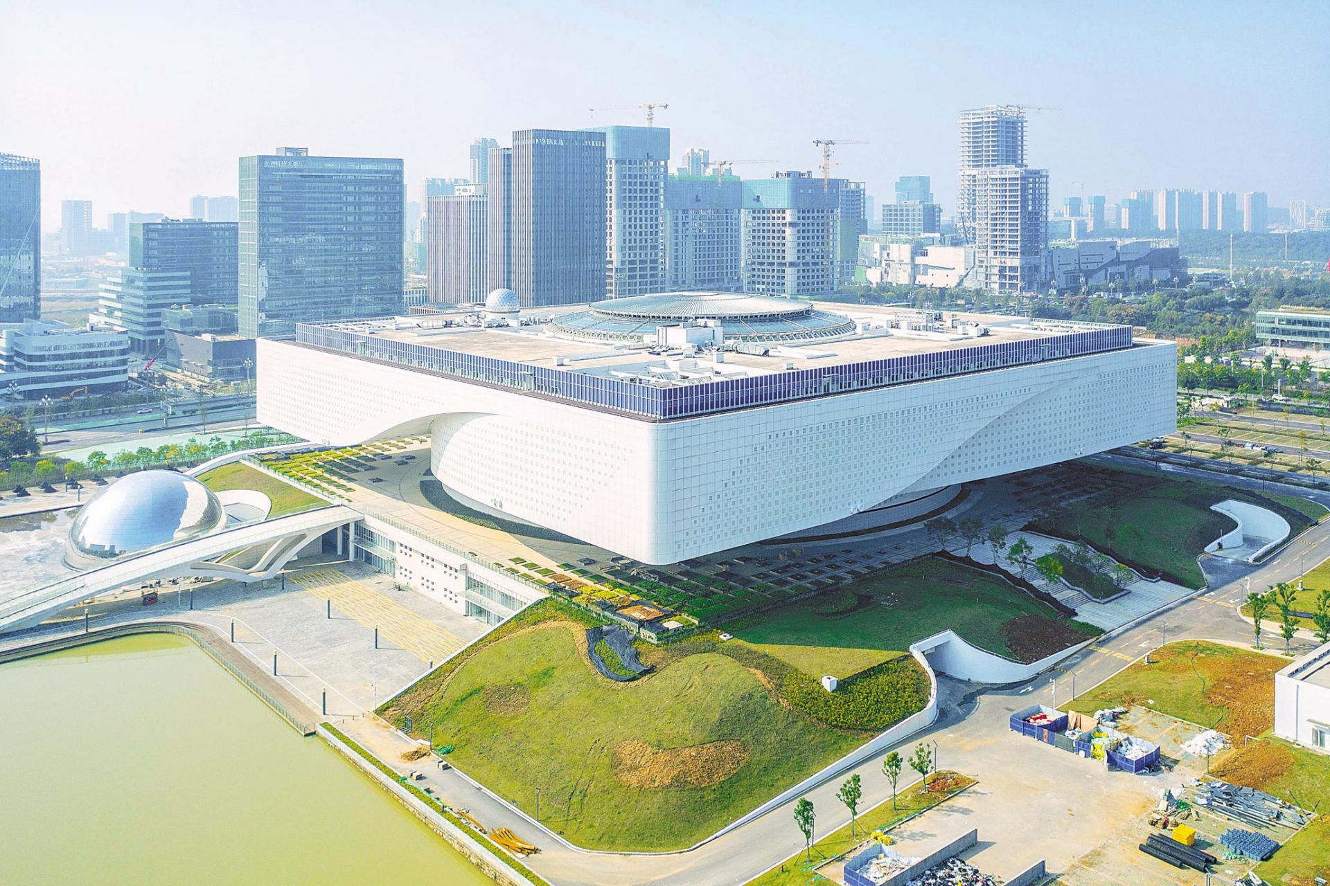 10月24日,在武汉光谷高新大道与花山大道交会处,矗立着一座白色带有螺旋曲线造型的立方体建筑,其左侧有一个巨大的银色圆球,右侧是一条弧形的景观桥,“天圆地方”造型引人注目。这是正在建设的湖北省科技馆新馆,工程项目主体建筑面积7.03万平方米,设置有展厅、儿童科学乐园、特效影院、科学教室、科普报告厅、公共空间展示区等,将为观众提供多种多样的科普体验。