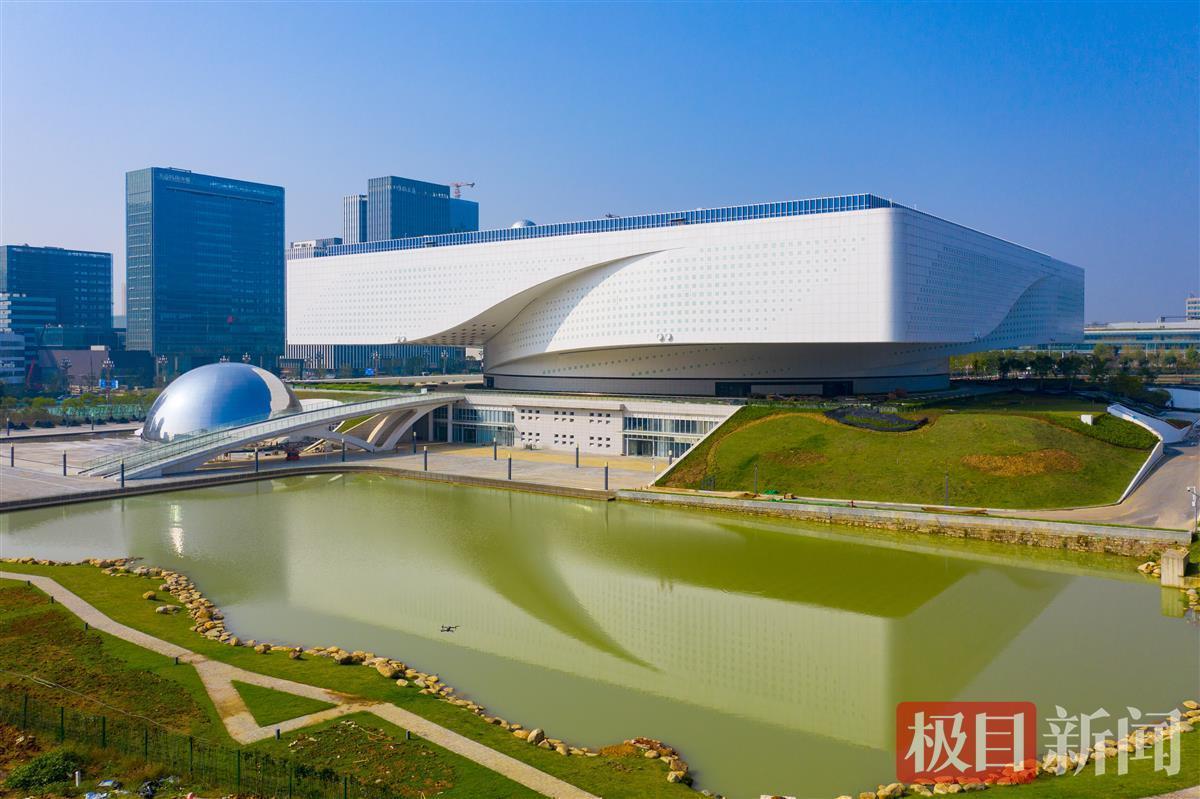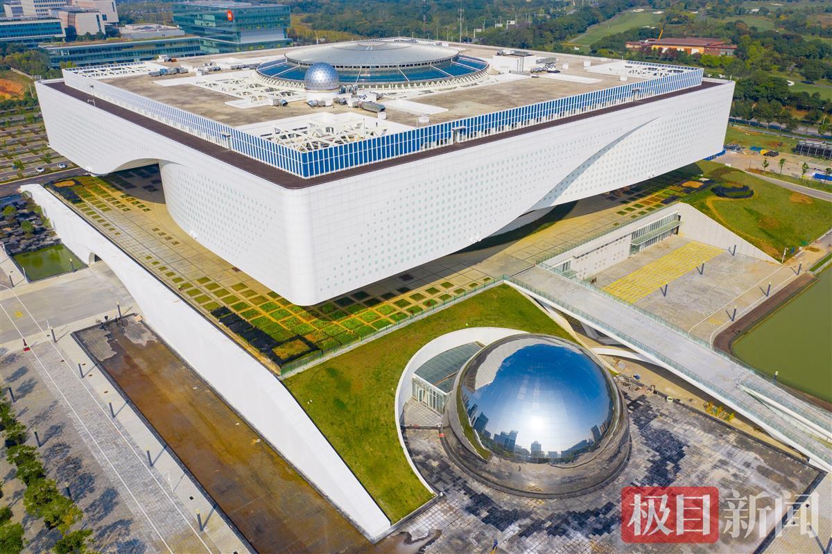10月25日,在武汉光谷高新大道与花山大道交会处,湖北省科技馆新馆形似一块腾飞的芯片,嵌入光谷核心;东侧一个巨大的银色圆球与它相伴,“天圆地方”的造型引人注目。据极目新闻记者了解,目前,科技馆新馆工程主体已完成,布展施工和展品制作安装等工作正在稳步推进。