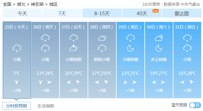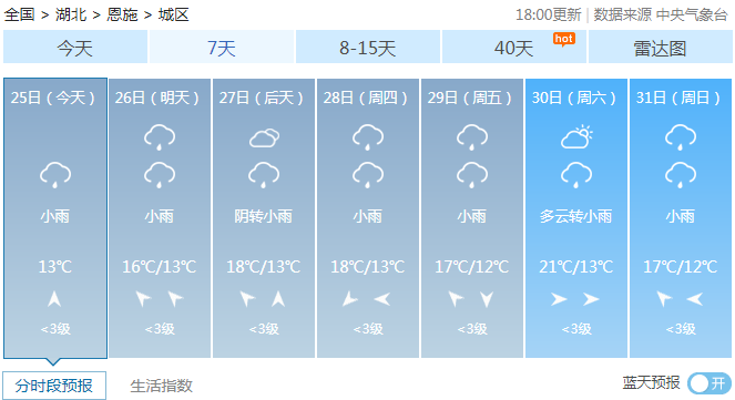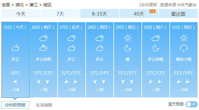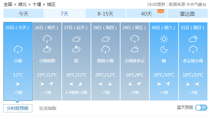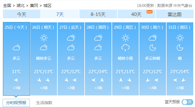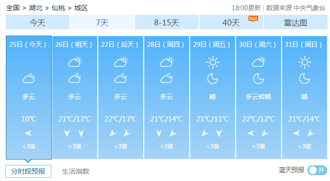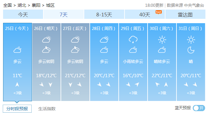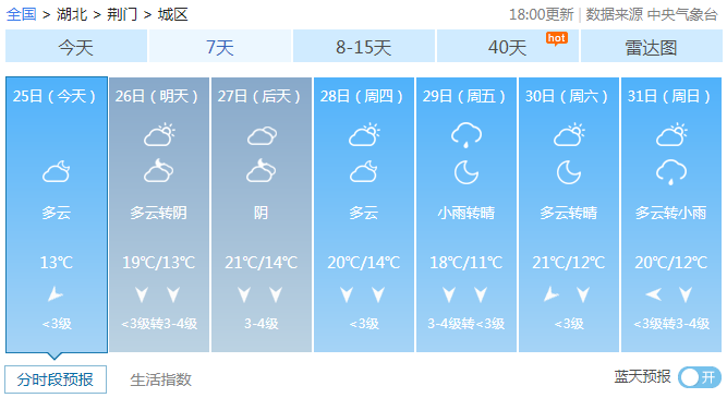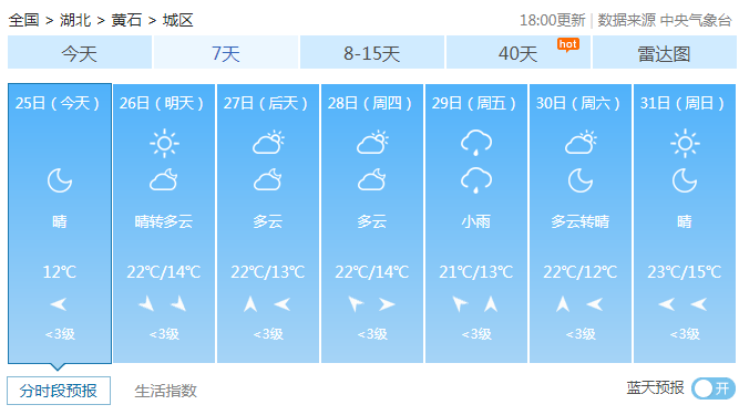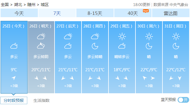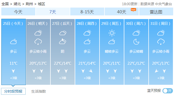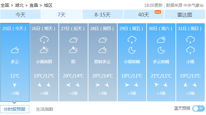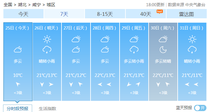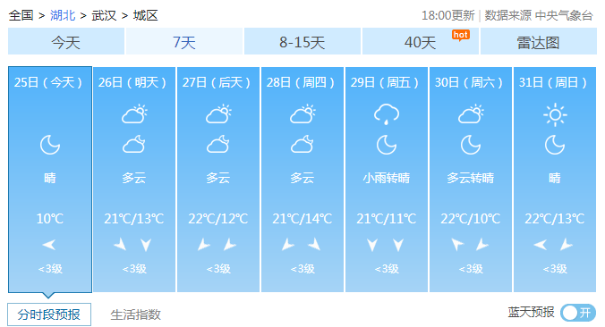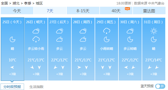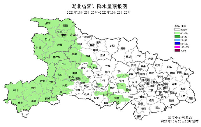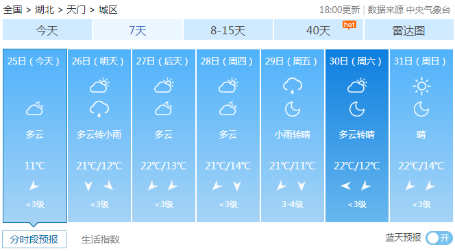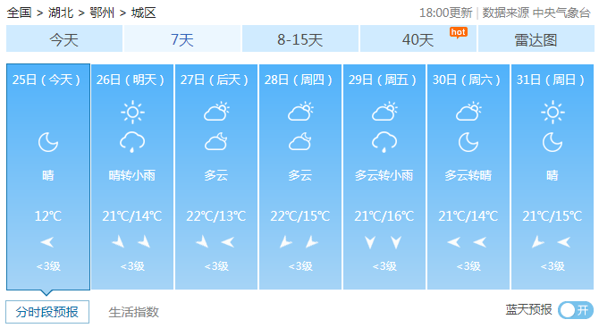 25日晚上:鄂西北、鄂西南多云转小雨;其他地区晴天到多云。