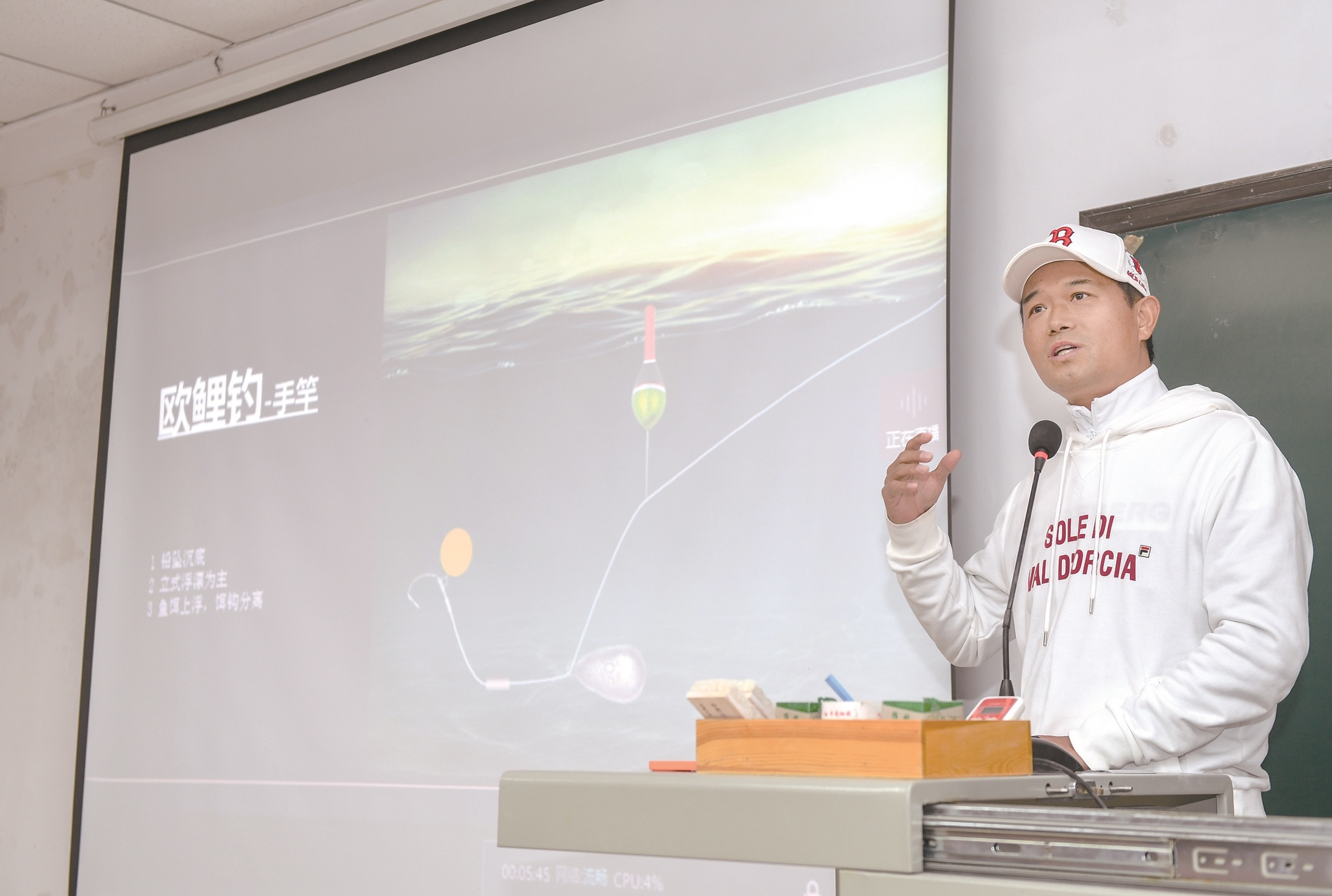 讲课正式开始后,邓刚拿出提前精心准备的PPT,向学生们介绍世界各地的垂钓方式和比赛。从手竿的欧鲤钓到美国的路亚比赛,从淡水抛竿到海上拖钓,邓刚结合图片和自身参赛经历,一一娓娓道来。他甚至用到了脱口秀中的call back(前后呼应),课堂上笑声不断。