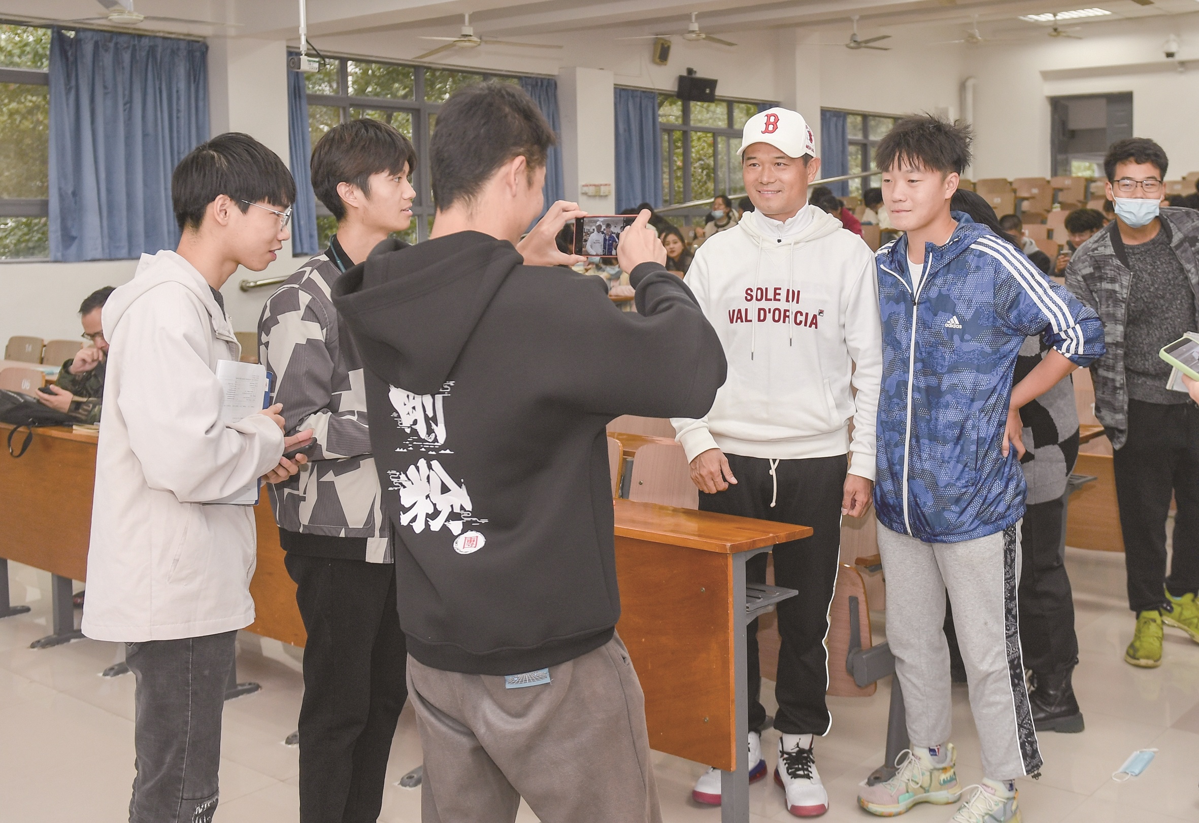 邓刚一走进教室,学生们就围上来求签名、求合影。邓刚也非常配合,他露出标志性的微笑,一一满足大家的要求。