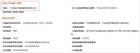 中国经济网北京10月26日讯 (记者 张海蛟) 近日,中山市消防救援支队东凤大队公示的行政处罚决定书将广东美的环境电器制造有限公司(以下简称:“美的环境电器”)列为行政处罚当事人,并给予深圳汇安消防设施工程有限公司罚款5000元的处罚。处罚事由为存在不按照国家标准、行业标准开展消防技术服务活动的违法行为。行政处罚决定书文号为山M(消)行罚决字[2021]0025号。