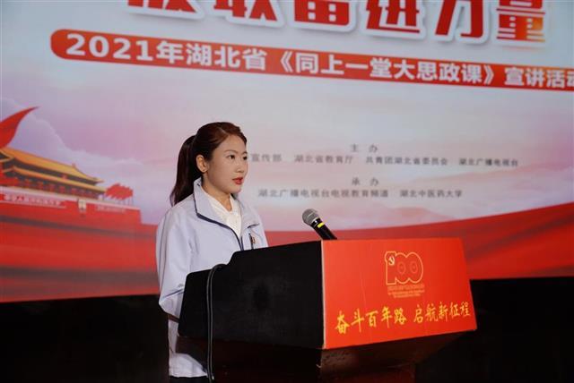 湖北日报讯(通讯员田梦莹)10月25日,2021年湖北省《同上一堂大思政课》宣讲活动在湖北中医药大学明德楼报告厅进行节目录制。活动邀请了全国抗击新冠肺炎疫情先进个人、被称为“最美逆行女孩”的甘如意现场讲述抗疫经历,邀请武汉市中山舰博物馆社教部讲解员谢蓓分享征集和收藏甘如意自行车的感人故事,现场医学生聆听了报告。