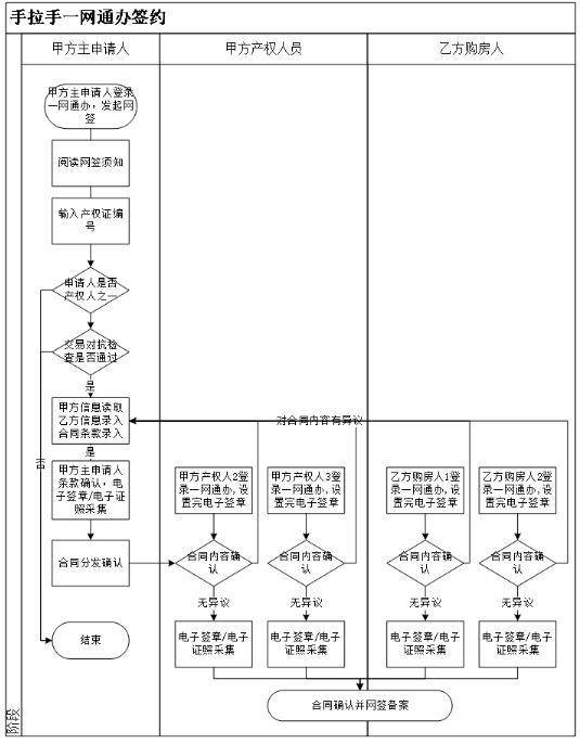 具体办件过程中,当事人可以登录“一网通办”,进入相关办件窗口查阅《上海市存量房买卖双方未通过中介交易网上签订合同(简称“手拉手交易网签”)须知》和《存量房买卖合同手拉手网签操作手册》。办理流程如下图: