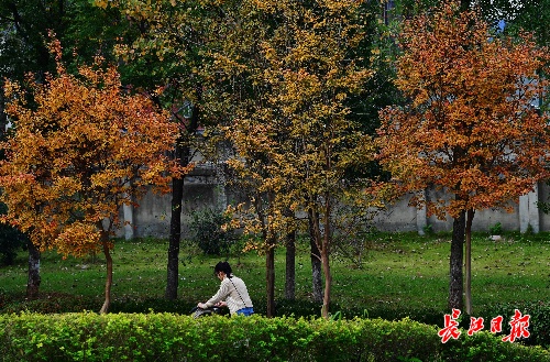 10月27日,阳逻柴泊湖休闲广场,几株紫薇树率先换上“秋装”,满树叶片在黄绿至橙红间转换,呈现出斑斓的秋季色彩。记者李永刚 摄