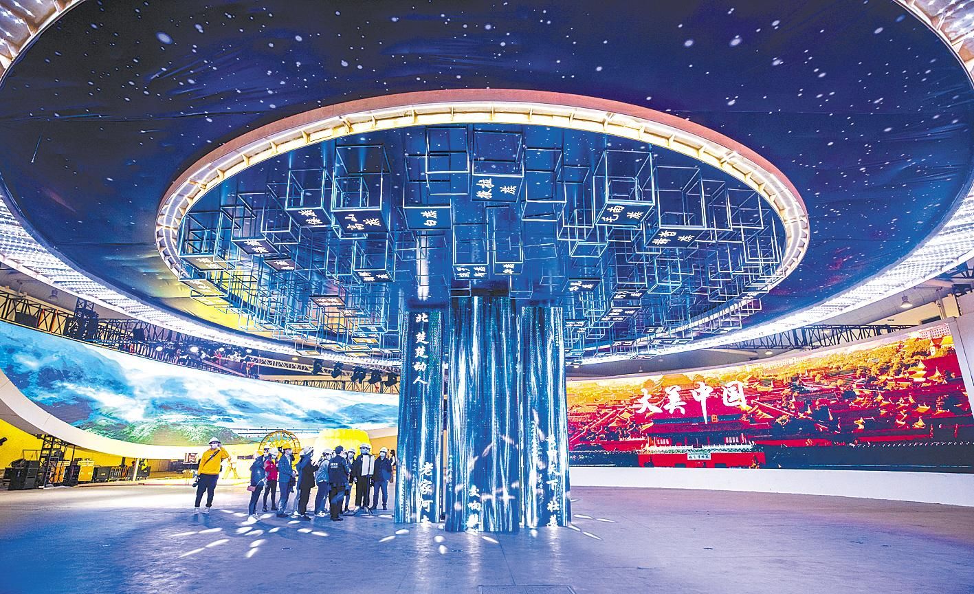 10月27日,“大美中国”展厅中央,“仰望星空”流体艺术装置展现大美中国的秀丽山河与中华文明发展图景。 (湖北日报全媒记者 柯皓 何宇欣 摄)