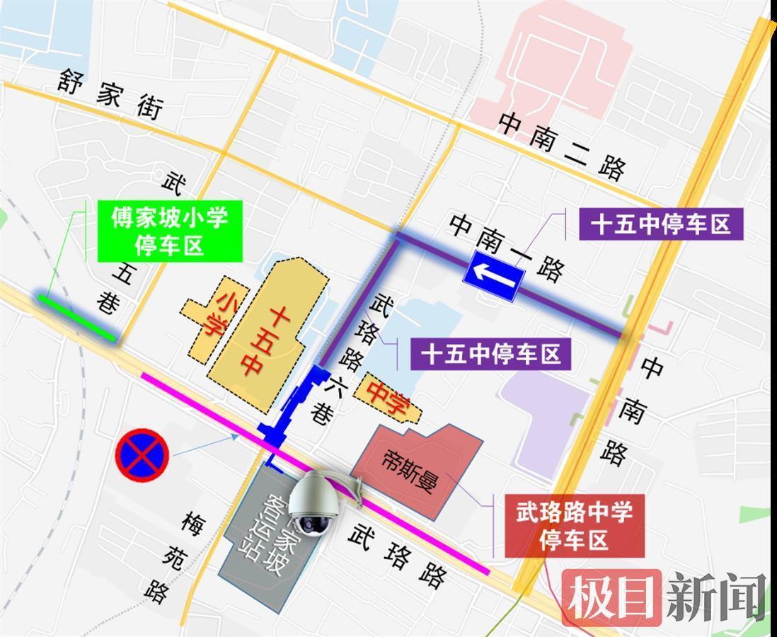 四、停车管理。施工期间武珞路(中南路-武珞路五巷)全线禁止停车。原周边学校接送学生需临时停车的车辆,建议临时停放以下位置:1、傅家坡小学接送车辆临时停靠武珞路北侧辅道;2、十五中接送车辆临时停靠中南一路、武珞路六巷(十五中宿舍至中南一路);3、武珞路中学接送车辆临时停放帝斯曼停车场(有600余车位,学生家长凭学生证,校服,家长群都可以去服务台办理免费停一个小时)。