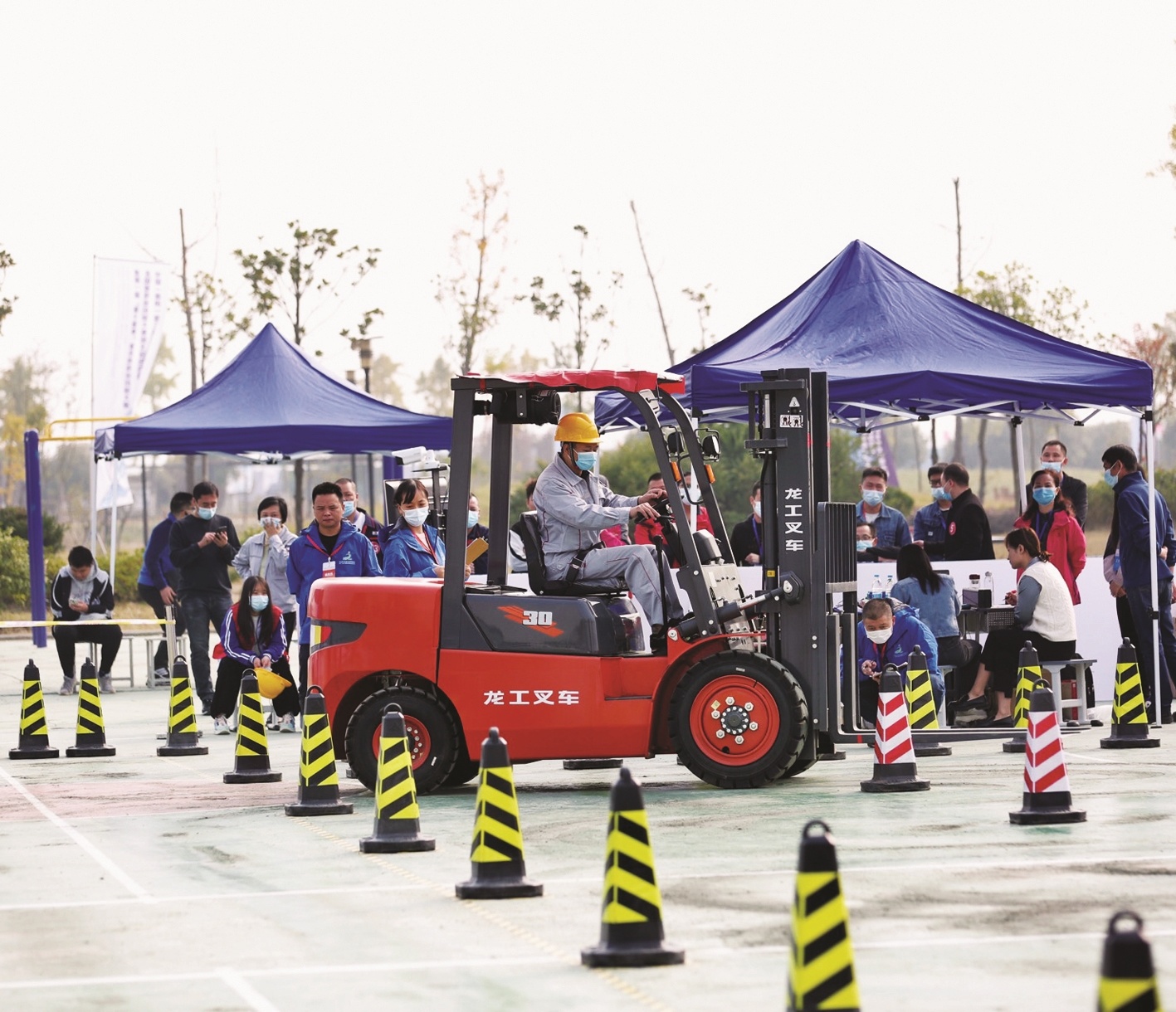 起重装卸机械操作工(叉车司机)驾车绕过障碍。