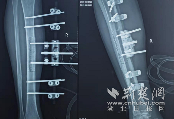手术中,医生在患者小腿骨上切一块骨片,用专用外固定支架固定,术后调节上面的螺纹杆,每天1毫米的速度把骨片横向搬移,两周后再慢慢移回原位。