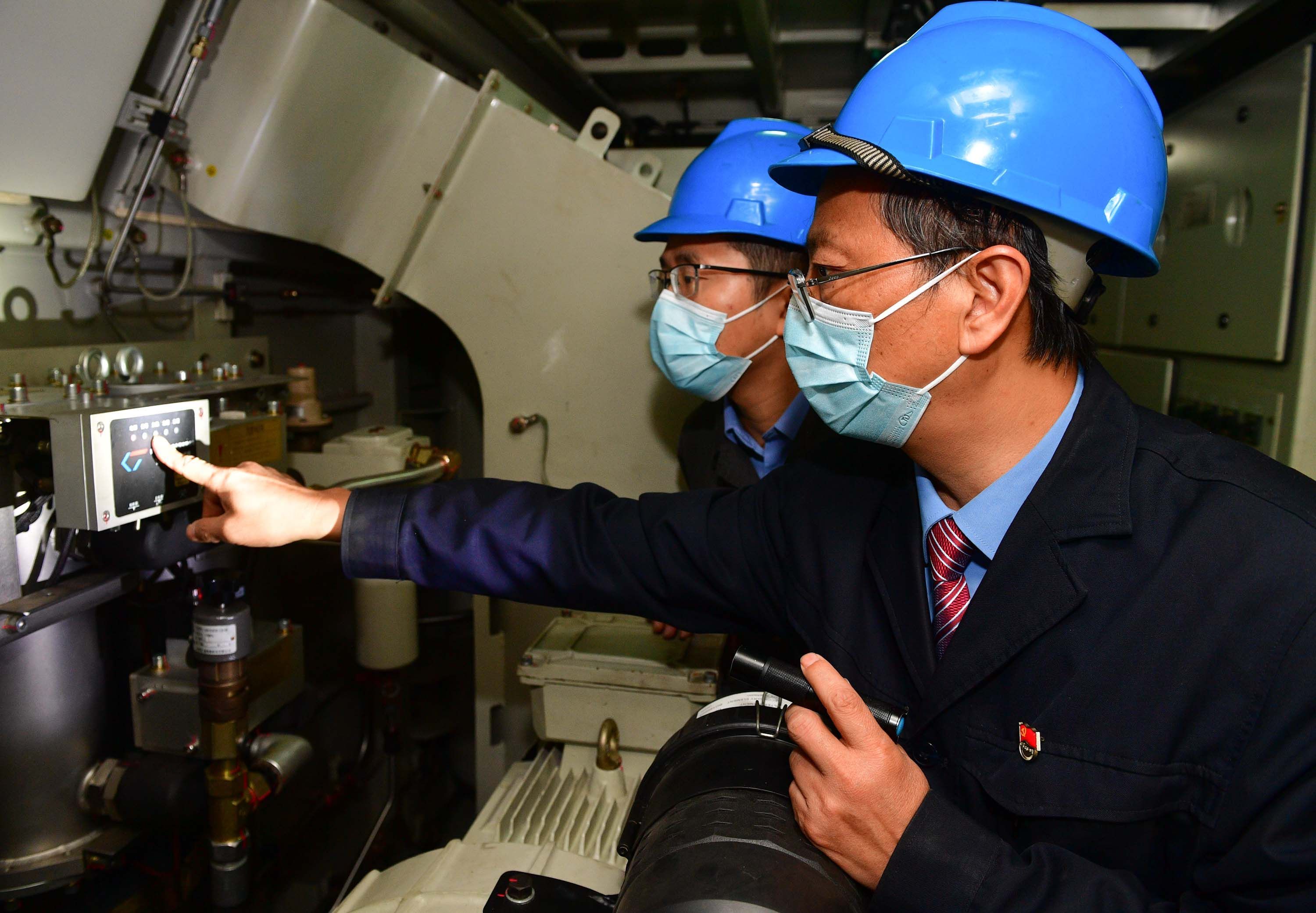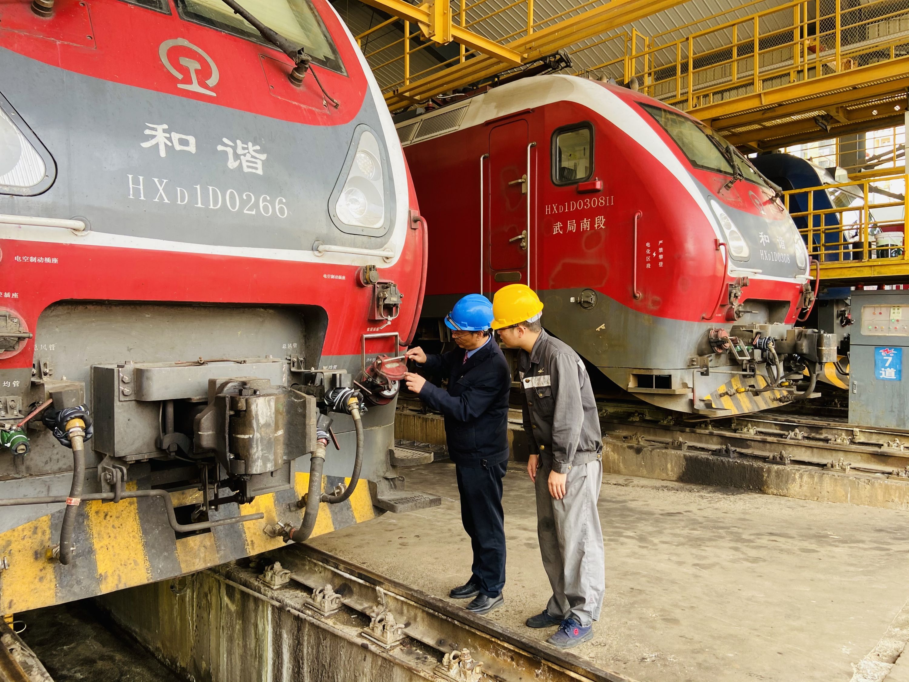 赵剑平(右)带着徒弟检查机车压缩机。长江日报记者李永刚 摄