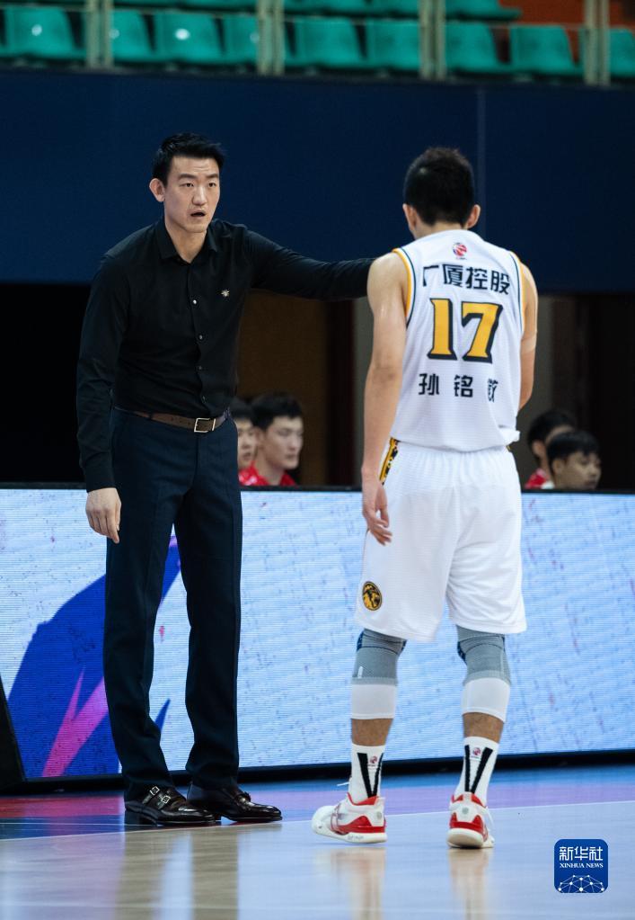 10月29日,浙江广厦控股队主教练王博(左)与队员孙铭徽在比赛中交流。