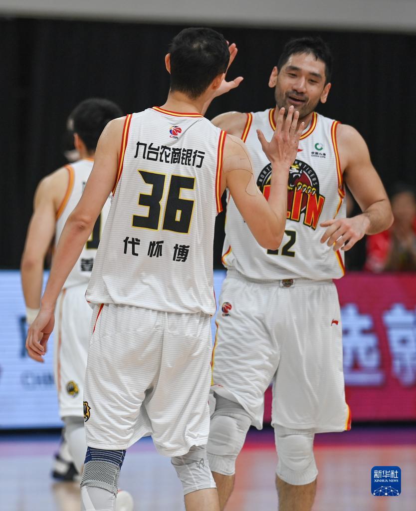 10月31日,吉林九台农商银行队球员钟诚(右)扳平比分后与队友庆祝。
