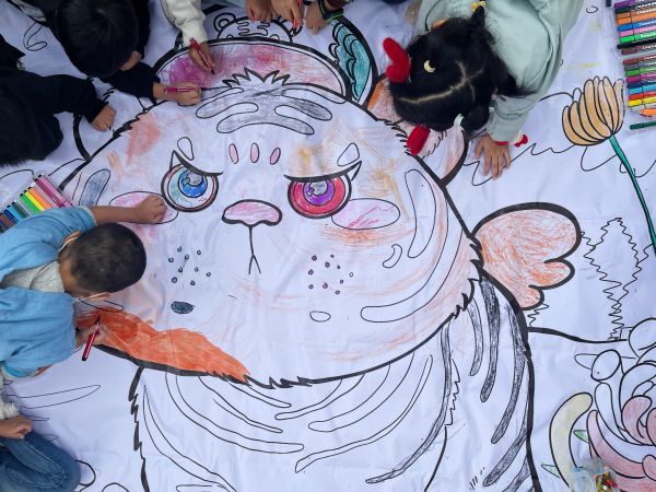 “方舱手绘小姐姐”黎婧绘制了“东北虎打卡菊花”的黑白手绘稿,孩子们把画稿铺在金秋菊展旁的草地上,趴在地上涂色。菊花的花瓣被涂成了七彩色,老虎的眼睛一只浅蓝一只粉红,和菊展现场相映成趣。“我听说解放公园有一片彩色菊花展区,这个不就是梦想中的画面变成了现实?”刘蓓蓓完成涂色后,兴高采烈地和父母一同寻找公园里展出的彩色菊花。