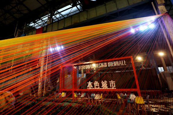 目前主展场全部展陈布置完成。走进大门,即可感受到设计的力量:深灰色钢铁厂房下,植物突兀生长,五彩绳索拉出彩虹。据设计师周全介绍,主展场空间的定义为“自由呼吸的钢铁森林”,整体空间布局没有按照绝对的物理格局来划分,“我们希望整个前场入口空间是完全开放共享的,与会观众可以自由地在此区域交流、沟通、休息。我们利用天然的植被摆放和铺设,营造出钢铁厂房同样有绿意盎然的景象。同时武汉是个多桥的城市,悬索结构是现代桥梁的标志,为了含蓄地表现这一结构,又透露出自然的味道,我们用线性绳索来模拟从天而降的彩虹。有人说看上去像拉索桥的钢缆,这同样映衬了武汉是桥梁之都的感受。”