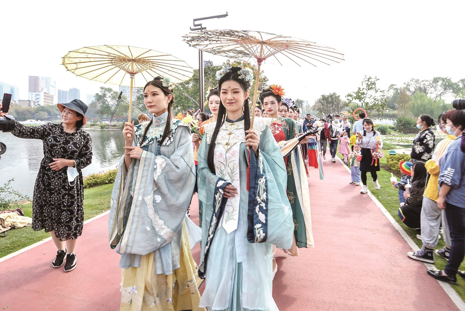 楚天都市报极目新闻讯(记者陈希)菊花笑盈盈,绽放紫阳湖。一群青春女孩身着汉服走秀,给武昌金秋菊展增添浓郁的文化韵味,令游园赏花的市民们陶醉其间。
