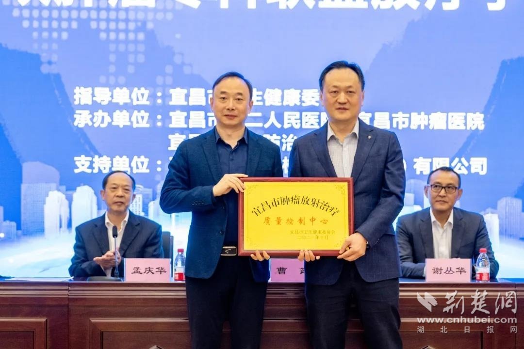 宜昌市卫健委副主任曹政(前左)为宜昌市肿瘤放射治疗质量控制中心授牌。