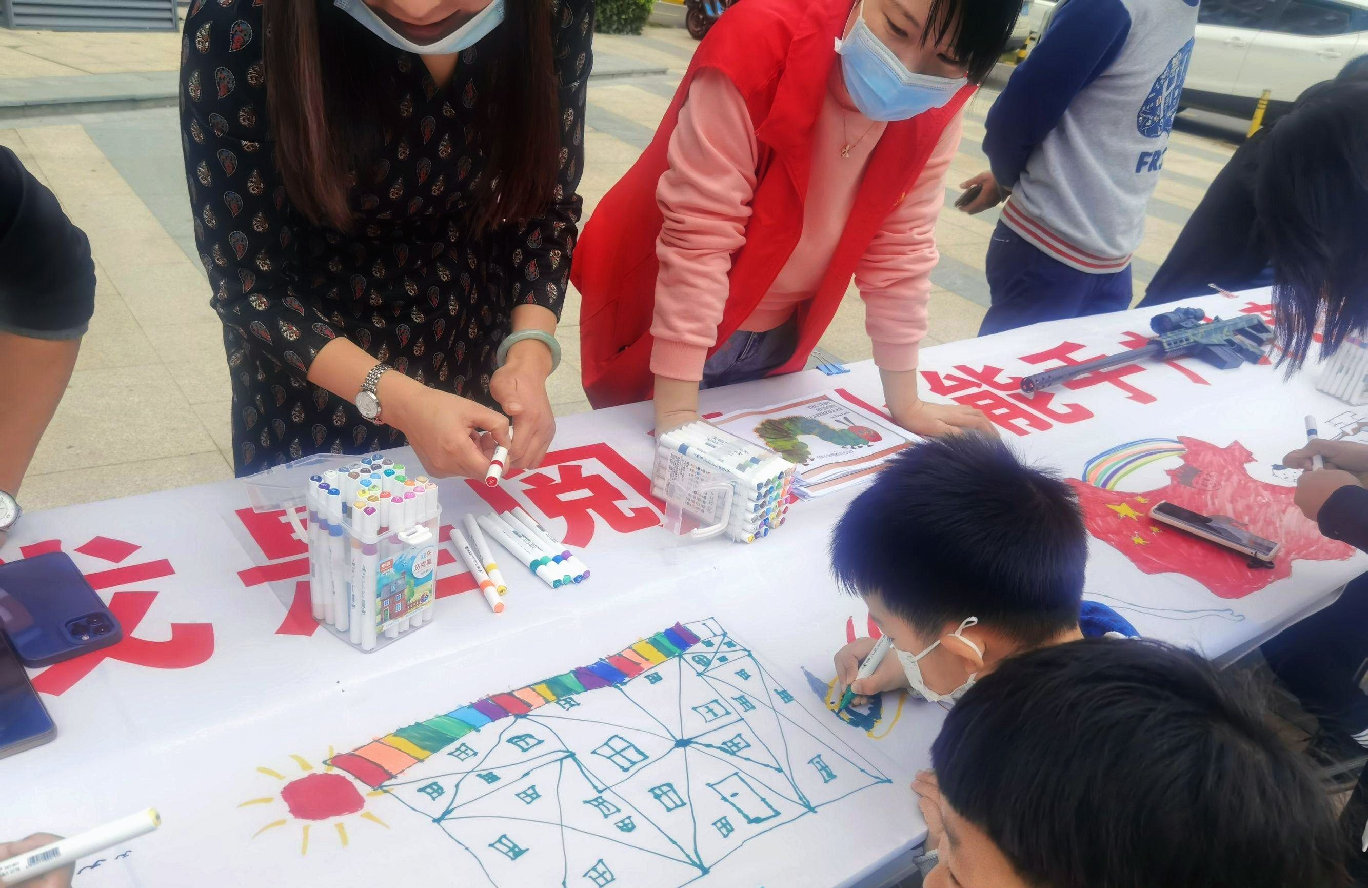 10米画卷上,文文小朋友的画吸引了不少人的注意。画面右上角是一个昂首向前的“金鸡头”,让人能迅速辨认出来这是一幅“中国地图”;画面左上角点缀了五颗金星,整幅画也用红色涂满。当文文妈妈陈女士问他为什么要把五星红旗和中国地图融合在一起时,文文说,这代表着五星红旗遍布在中国的每个角落。
