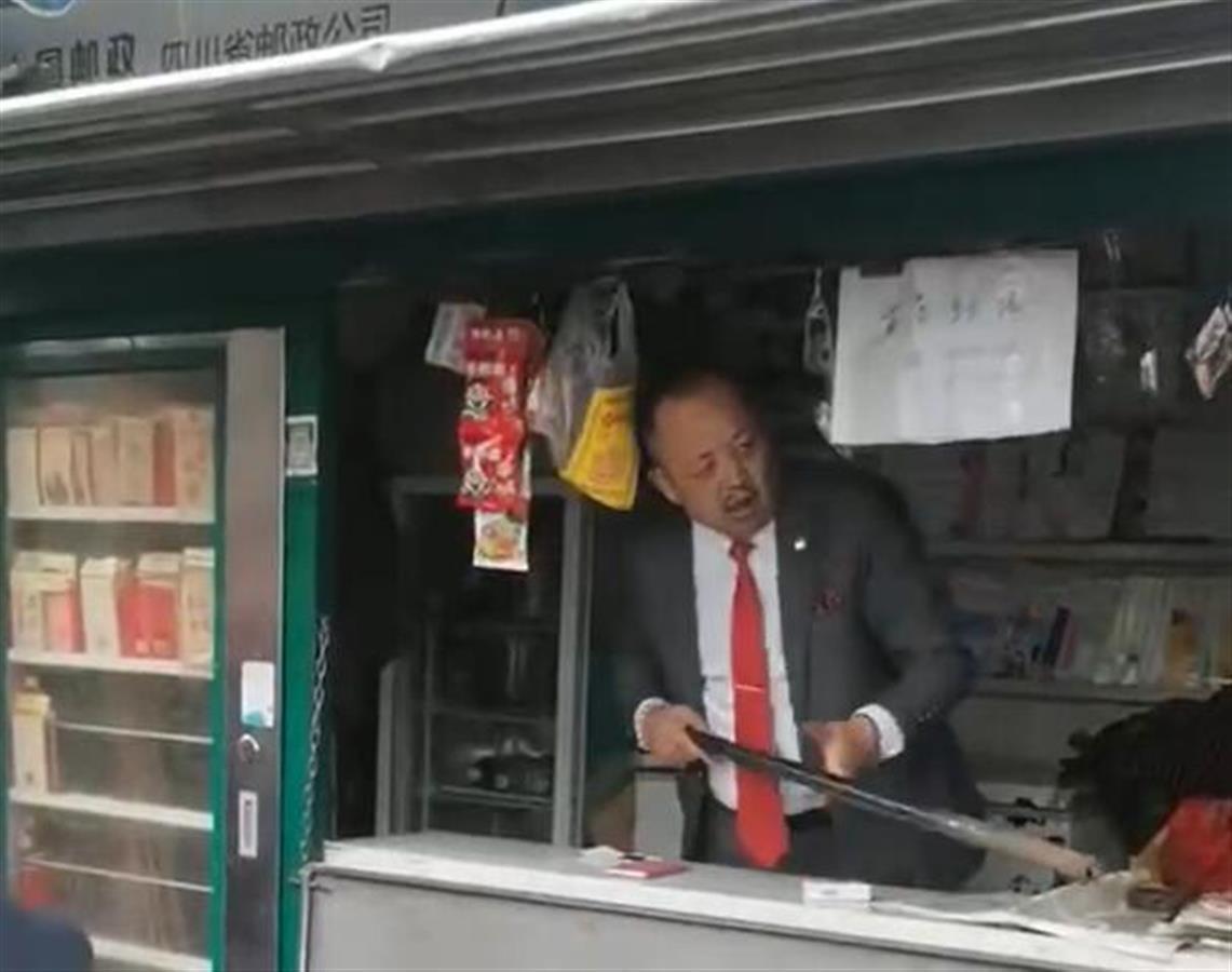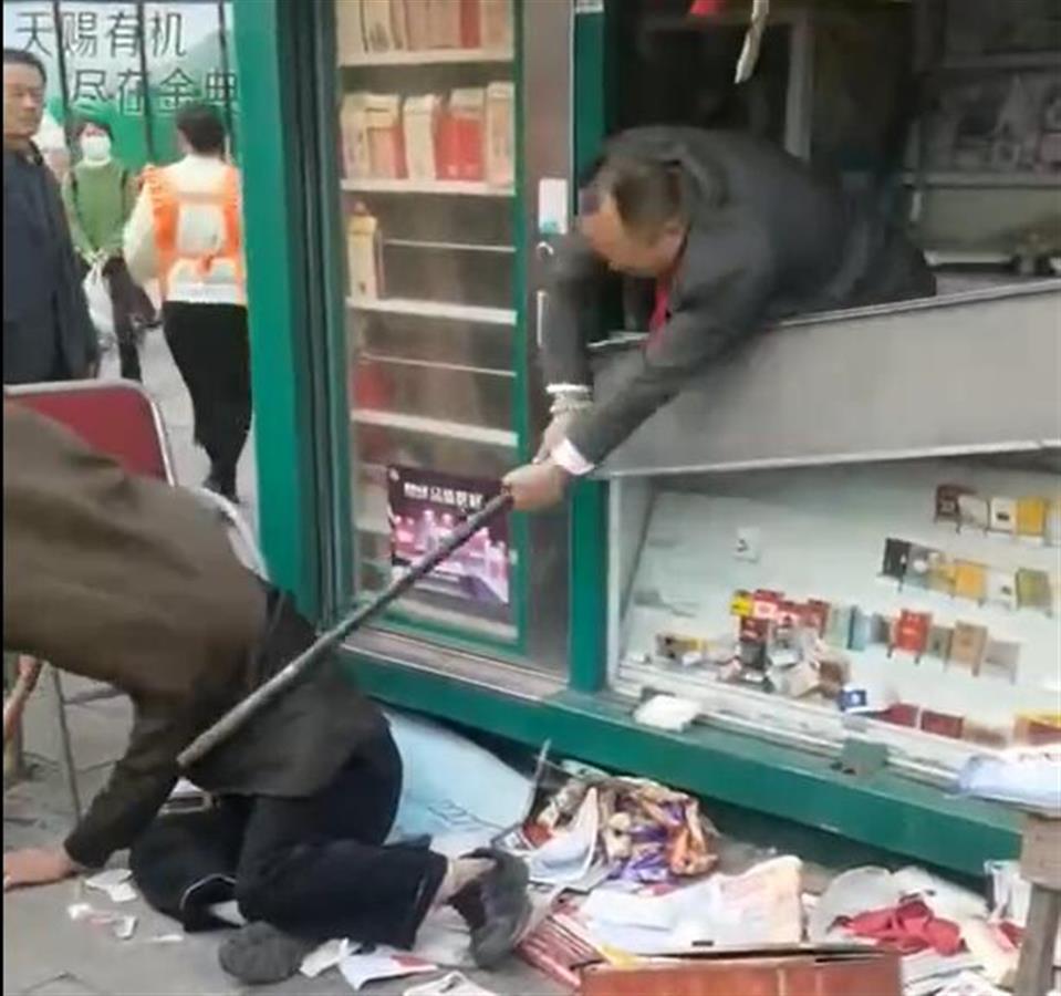 极目新闻记者在视频中看到,在一个街头书报亭内,报纸和商品散落一地。一名身穿西装的中年男子站在书包亭里面,手中持棍,不停地伸出柜台打一名老人。被打老人头发花白,已被打倒在地,头上还流着血。一名女子护着老人,还用小板凳还击男子。附近的群众都义愤填膺,并指责男子。视频中有人喊“城管打人了”,还有人打电话报警。
