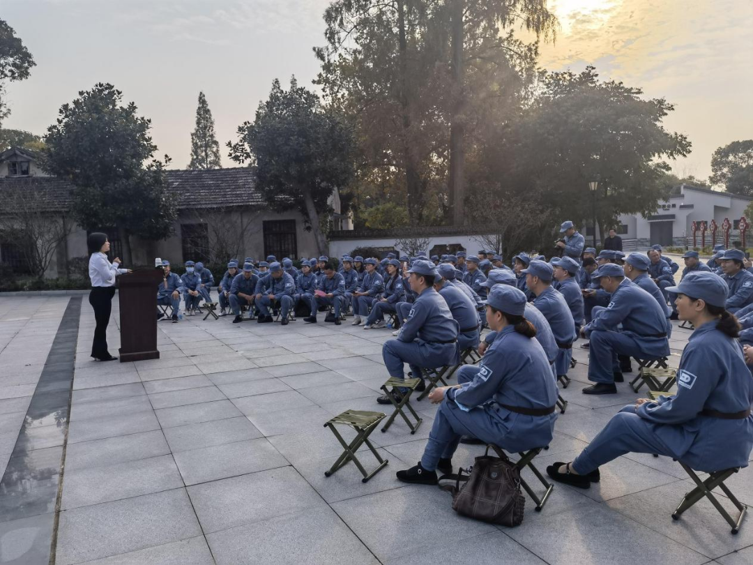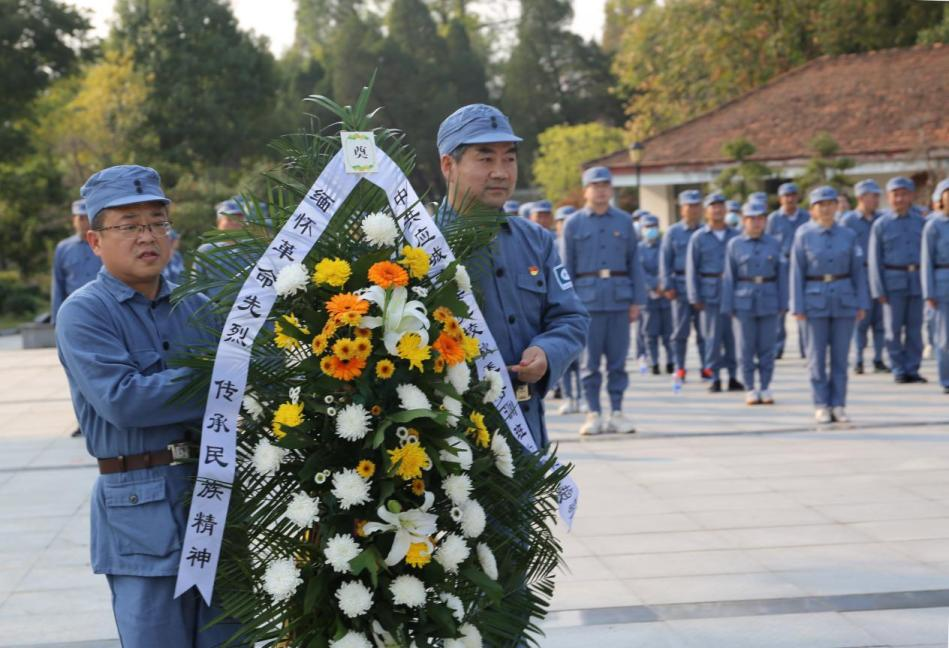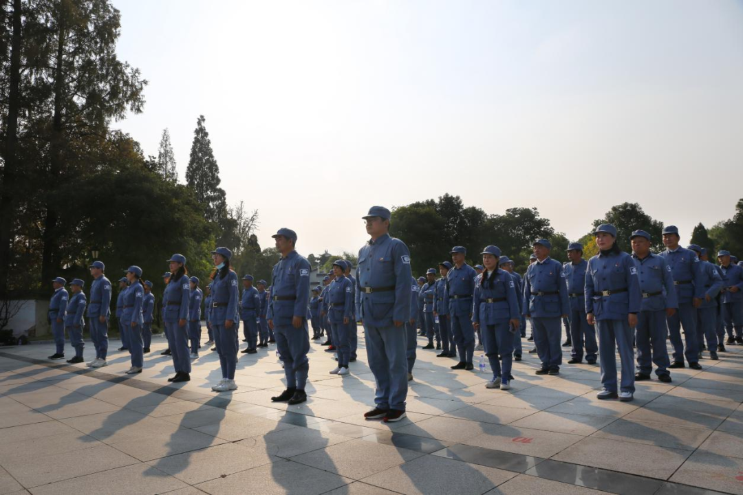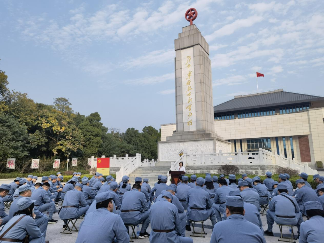 全体学员身着新四军服、佩戴党徽、整齐有序、精神饱满地走进革命烈士纪念广场。革命烈士纪念碑庄严肃穆、巍然屹立。大家站在烈士纪念碑前集体默哀,敬献花篮,在党旗下重温入党誓词,在纪念碑前绕行瞻仰,深切缅怀革命先烈。