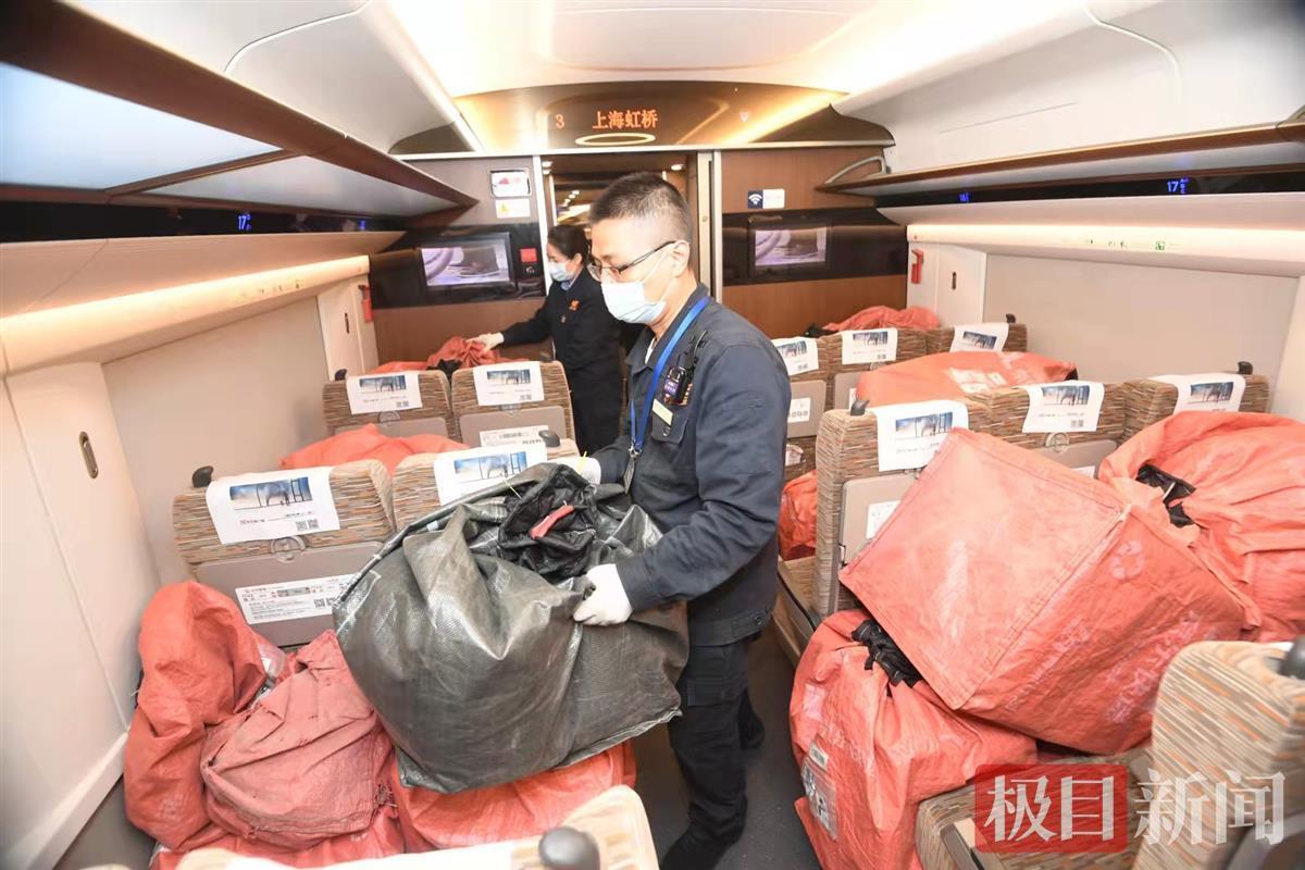 1日清晨7点半,极目新闻记者在武汉站4站台看到,开往上海方向的G1722次复兴号列车,已经稳稳地停靠在站台上,工作人员正在将一包包货物搬运上车。列车专门预留出3号车厢,这节车厢内没有一名旅客,存放的全部是电商快件。