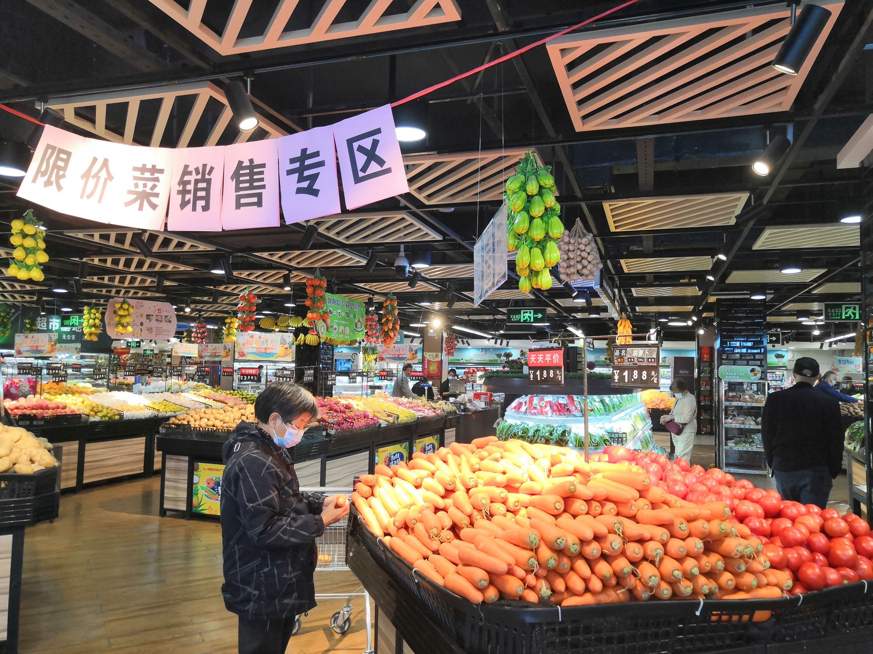 上午11点,在中商超市徐东店的蔬菜售卖区,限价菜销售专区的标志也高高挂起,7个品类分为3个货架供消费者挑选。