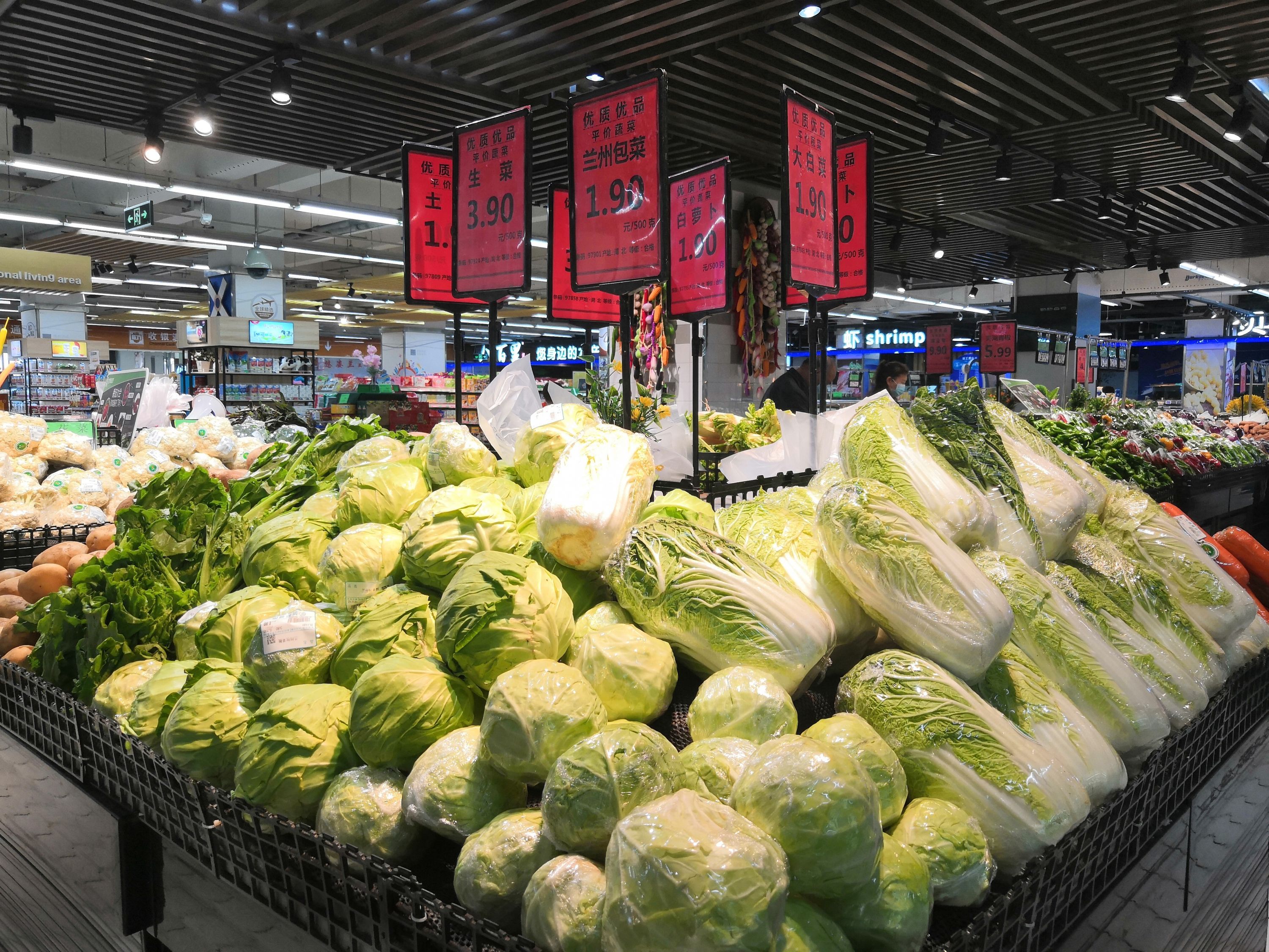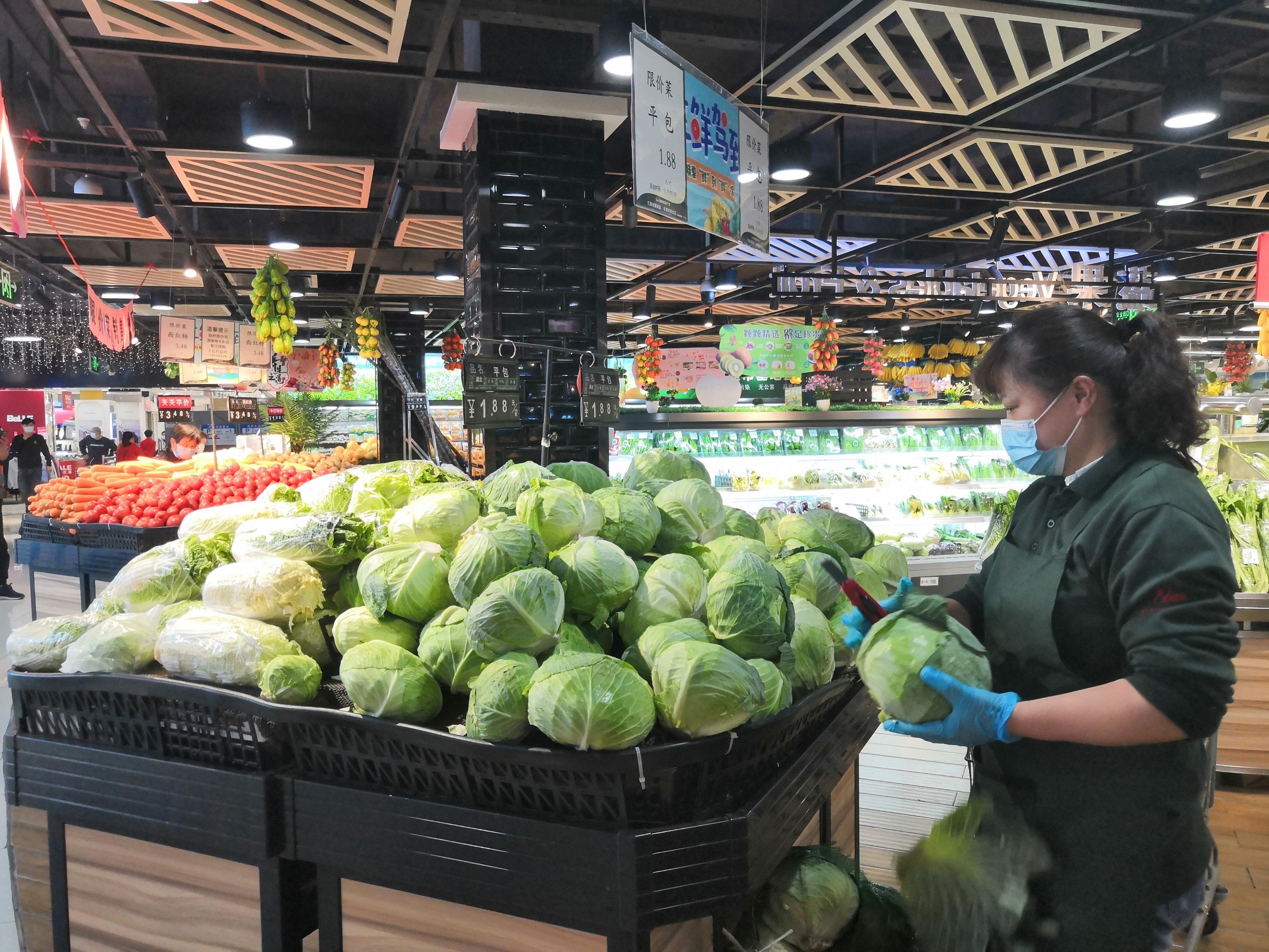 中商超市徐东店,售货员正在给包菜货架上货。见习记者陈紫云 摄