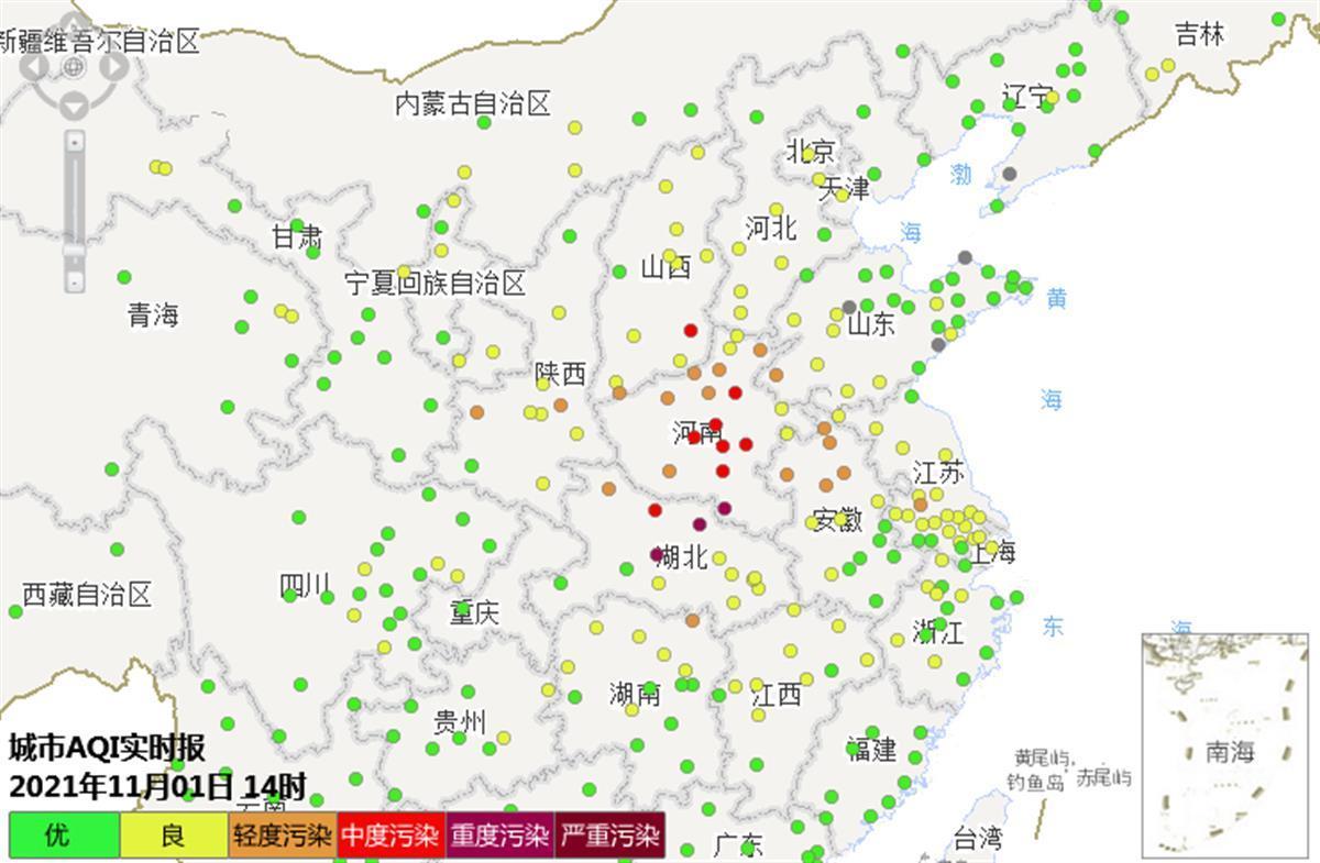 武汉生态环境监测中心消息,11月1日截至15时,武汉城区空气质量指数为74,空气质量为良,首要污染物为NO2。全国范围内,河南大部、吉林、陕西、江苏、新疆等部分城市为轻度到重度污染,首要污染物为PM2.5。省内随州、荆门为重度污染,襄阳为中度污染,十堰为轻度污染,首要污染物为PM2.5。