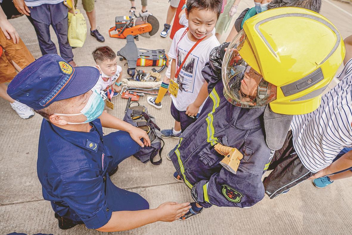 消防开放日,小学生们体验消防装备(资料图)