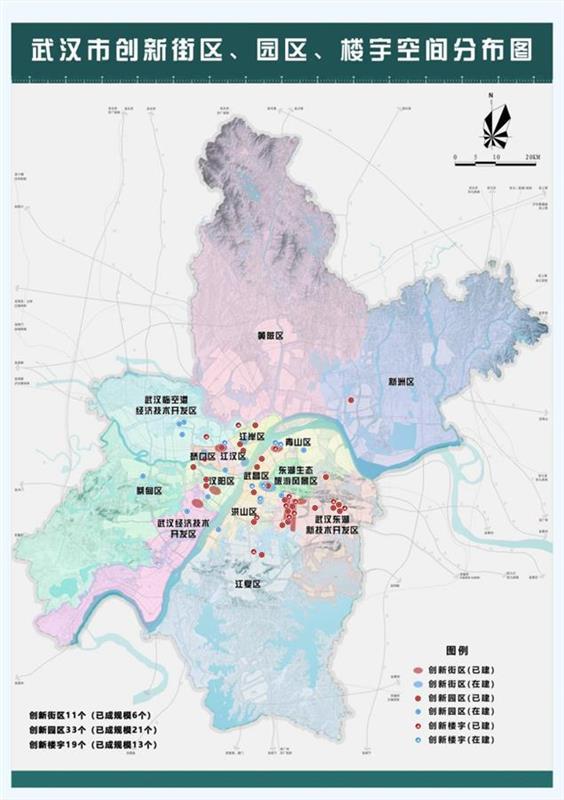此外,创新地图从区域协同创新格局、“一核一城一圈”全域科技创新格局、创新载体规划布局层面描绘武汉市科技创新发展蓝图,展示了武汉全市规划布局的63个创新街区、园区、楼宇,其中创新街区11个,创新园区33个,创新楼宇19个。
