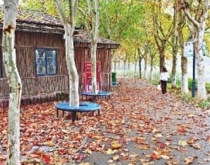 11月5日,天气阴沉,不时落下丝丝细雨。金银湖湿地公园绿道黑色的沥青路面上,铺满了被雨打落的黄叶。