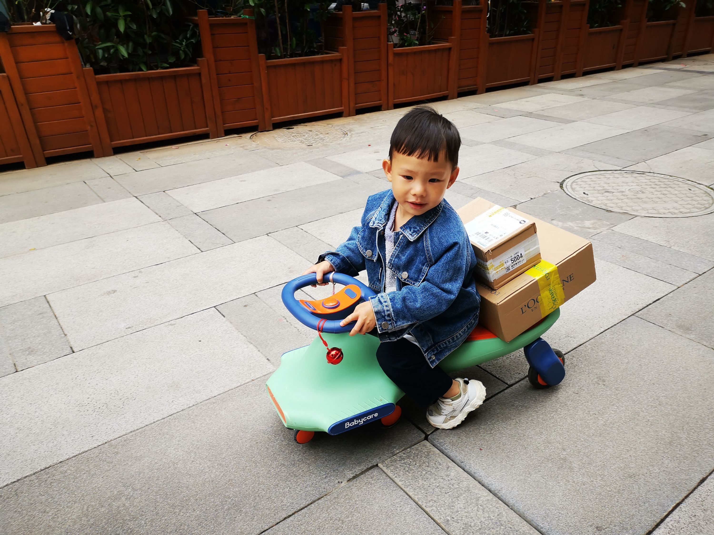 6日中午11时许,在欢乐大道的正堂山外山小区,两岁半的小男生“小金豆”骑着小童车,陪奶奶来到菜鸟驿站正堂山外山店。店外的路面上,临时摆放着上百件刚送到的快递物品,他蹬着童车在这些快递物品所构成的“巷道”间开心穿行。