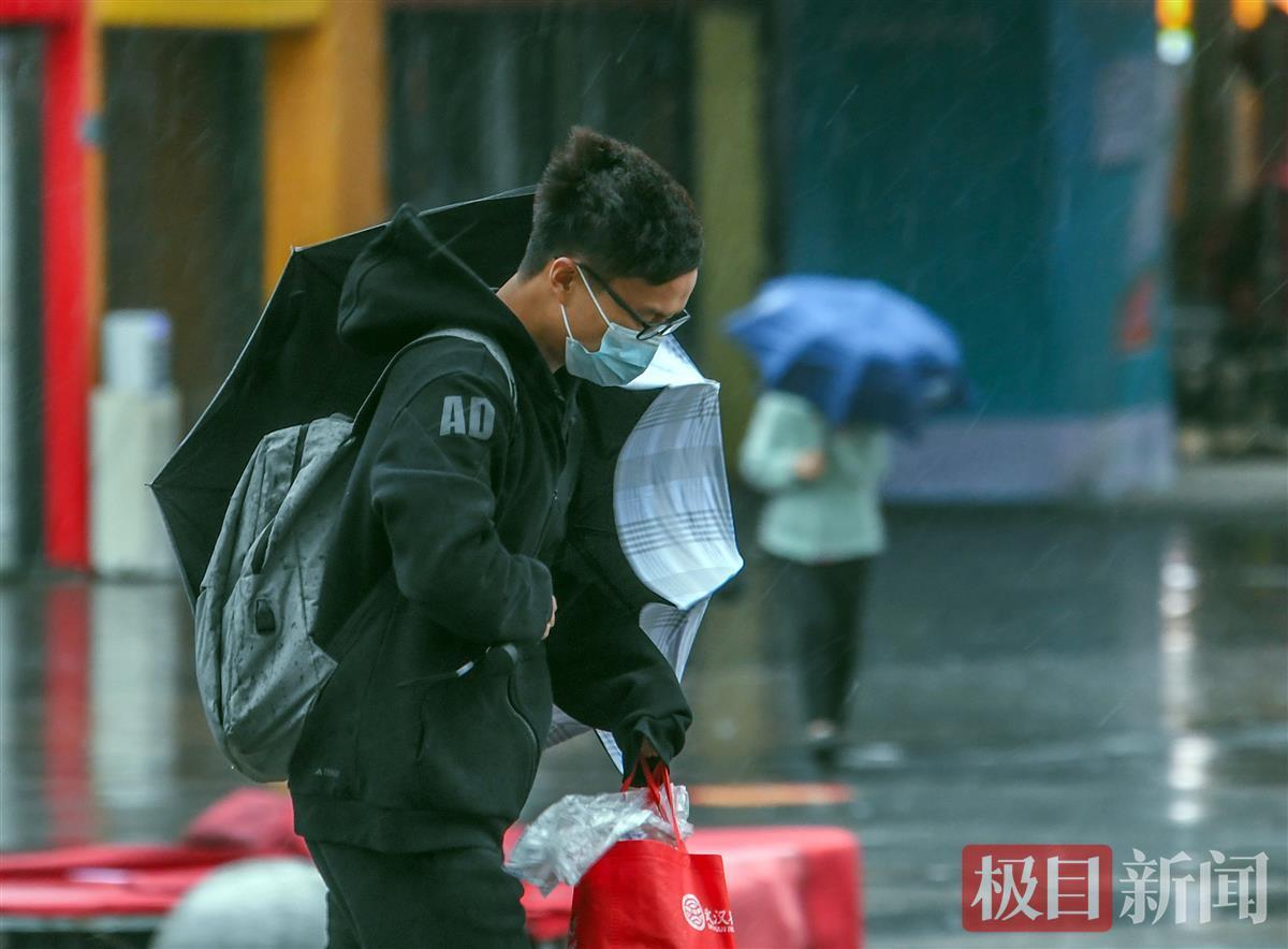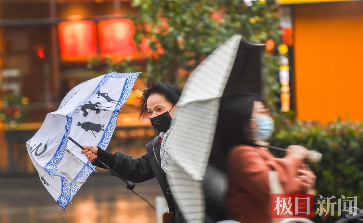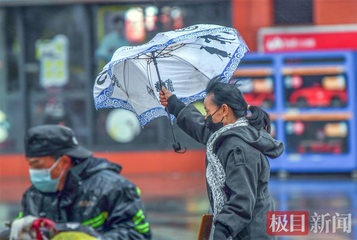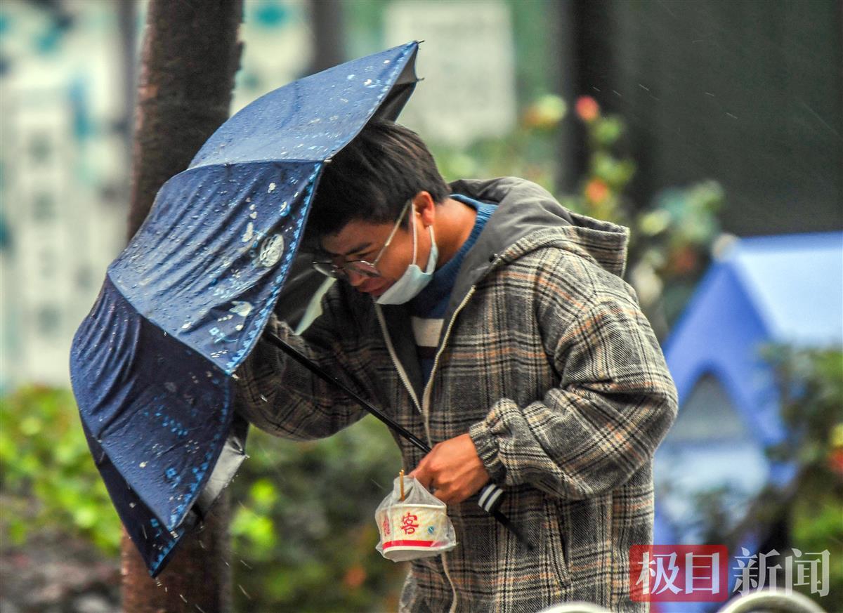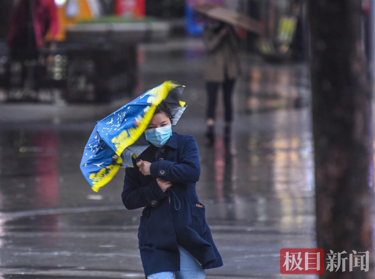 11月7日,武汉,北风强劲、寒雨乱刮,寒潮强势进驻武汉,武汉这个立冬来得轰轰烈烈。当日早上,武汉刮起5-6级北风,气温狂降14℃,市内最低温度只有2℃。在武汉市洪山区雄楚大道熊家咀,出行的人在风雨中撑伞相当困难,不少市民直呼好冷啊!