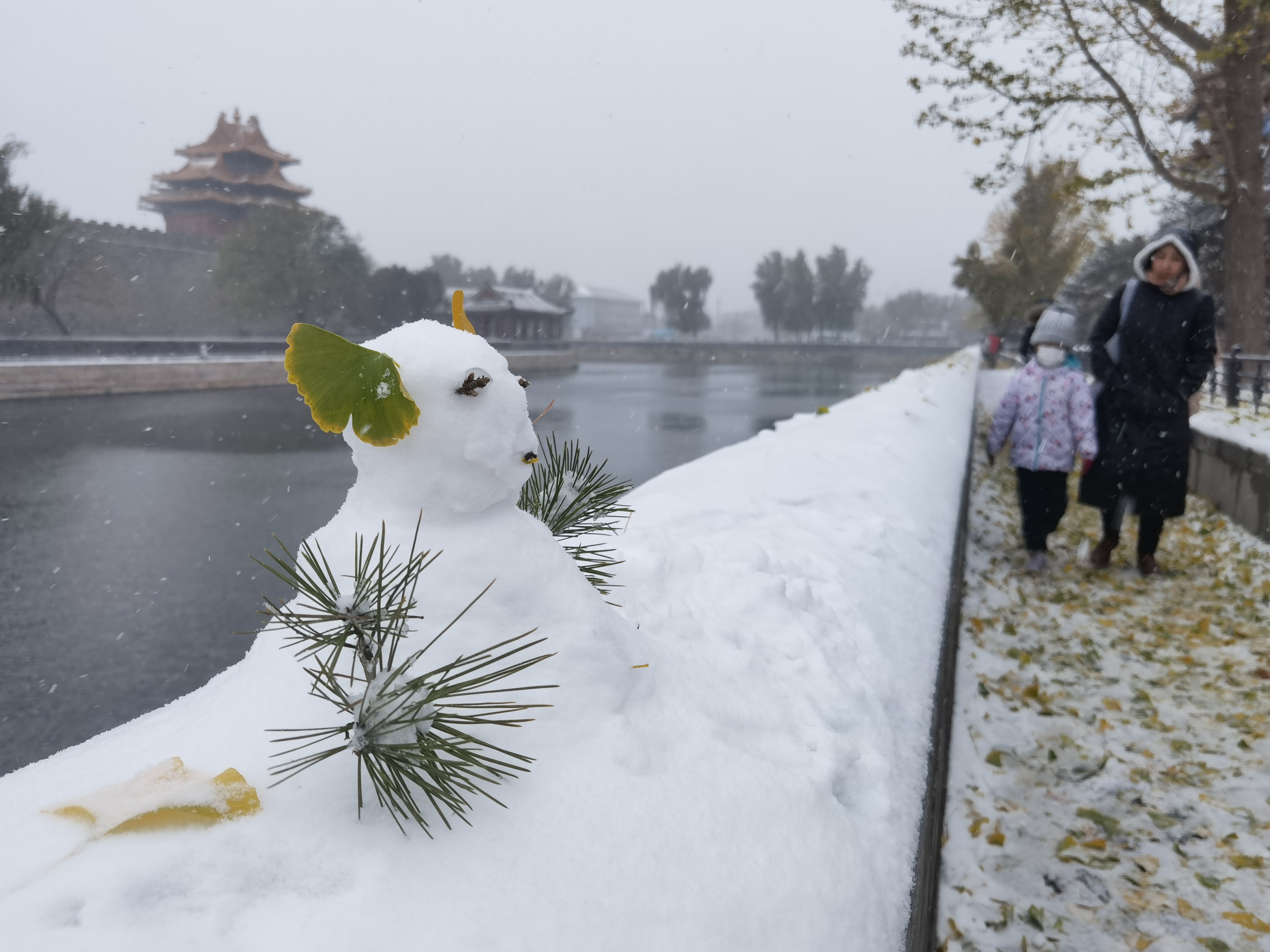 11月7日,北京故宫角楼下,市民从一个小雪人旁经过。中国日报记者 王敬 摄