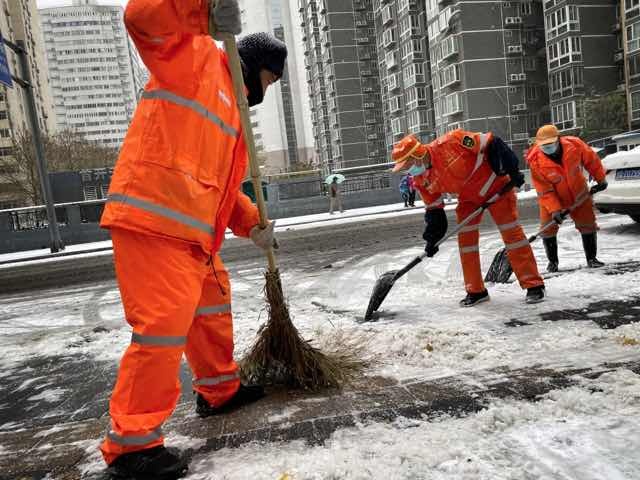 11月7日,北京市西城区,环卫工人清扫路面积雪。中国日报记者 杜涟猗 摄