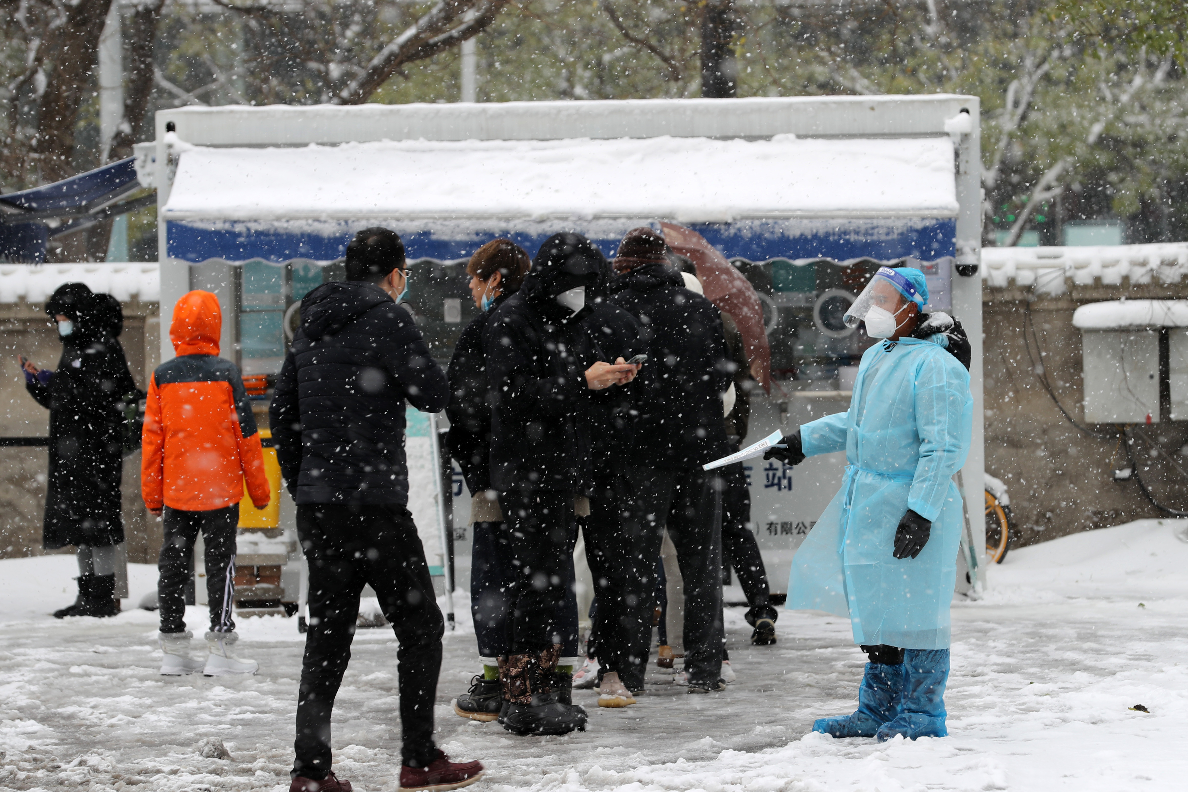 11月7日,北京亮马桥一处核酸检测点,市民雪中排队进行核酸采样。中国日报记者 王壮飞 摄