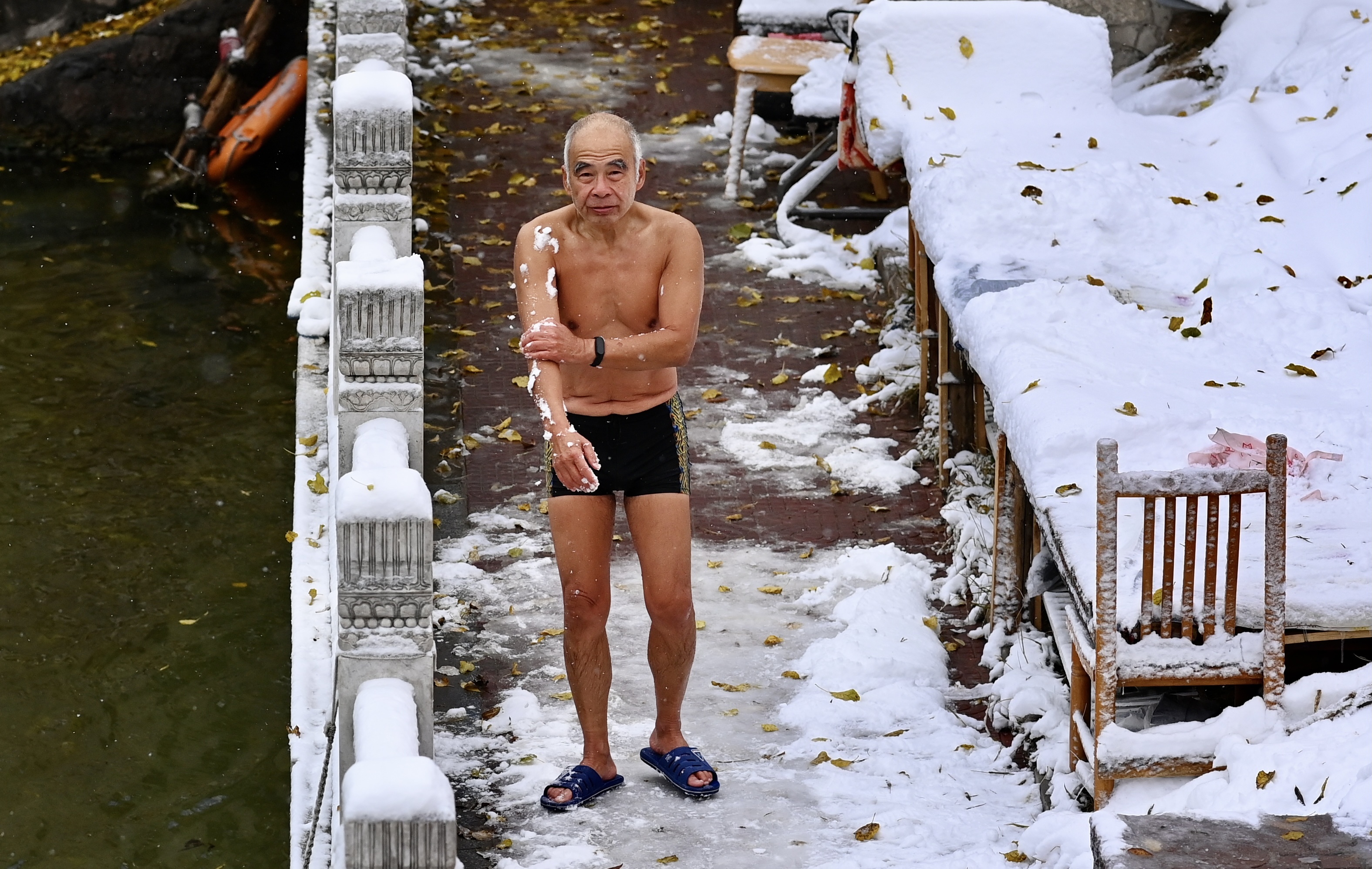 11月7日,北京颐和园南如意门外,一名冬泳爱好者用雪擦拭身体。