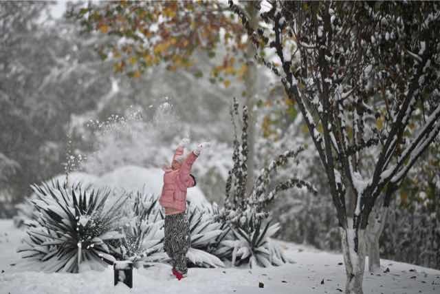 11月7日,北京市海淀区一小区,一名小朋友在雪中嬉戏。中国日报记者 魏晓昊 摄