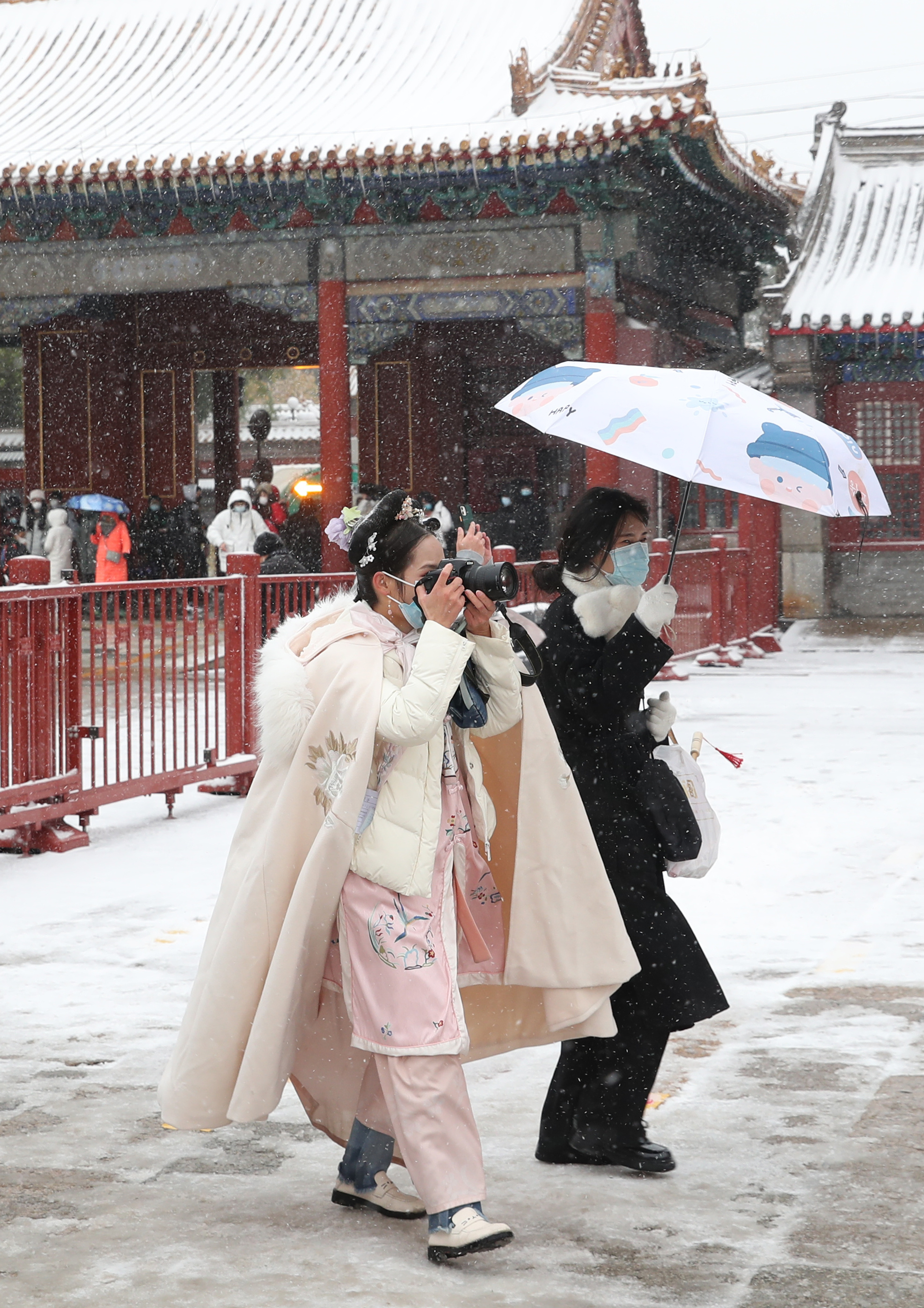 11月7日,一名身着汉服的女子拍摄北京故宫雪景。中国日报记者 邹红 摄